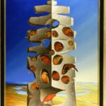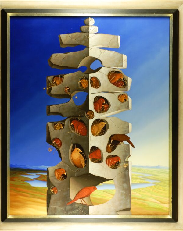 Mit Mittelpunkt des Bildes steht eine Felsensäule mit zahlreichen Nischen und Höhlen, in denen eine Vogelkolonie lebt. Einige Vögel warten auf ihren Partner, dass dieser zurückkommt. Andere Vogelpaare sitzen vereint gemeinsam in ihrer ausgewählten Felsenhöhle. Die Bildaufteilung des Hintergrundes (Erdboden/Himmel) und die intensive Blaufärbung des Himmels lassen den Felsklotz noch imposanter erscheinen. Das Bild verfügt über einen einzelgefertigten Modellrahmen.
