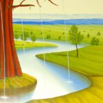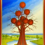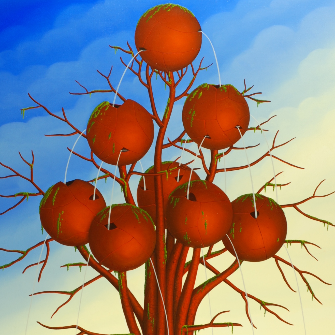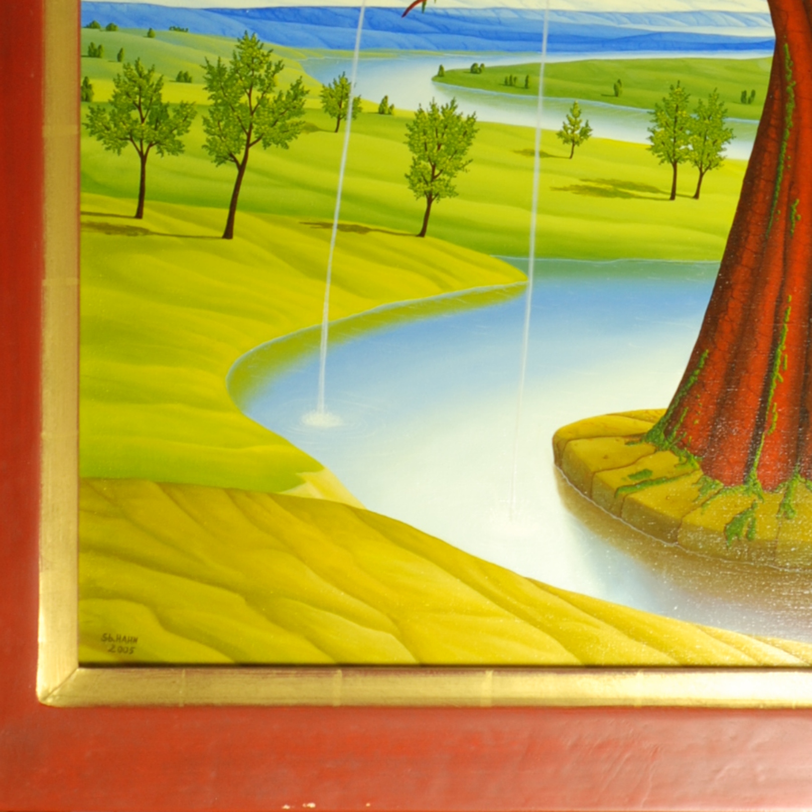 Im Mittelpunkt des Gemäldes steht ein Baum mit Phantasie-Früchten, aus denen lebenspendendes Wasser in die Landschaft fliesst. Die hellgrüne Landschaft und der hellblaue Himmel umrahmen den rötlichen Baum. Die 2:1-Bildeinteilung lässt den Baum zusätzlich imposant im Zentrum des Bildes erscheinen. Die Kraft des Wassers und somit die Kraft des Lebens wird stark unterstrichen. Das Gemälde hat einen einzelgefertigten Modellrahmen mit Applikationen von Blattgold. Das Gemälde ist auf der Vorder- und Rückseite datiert und signiert.