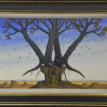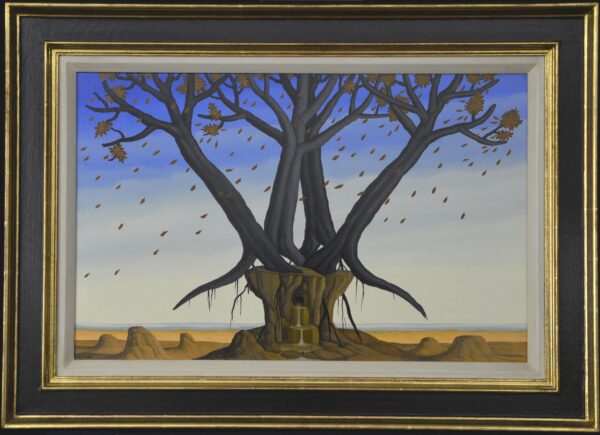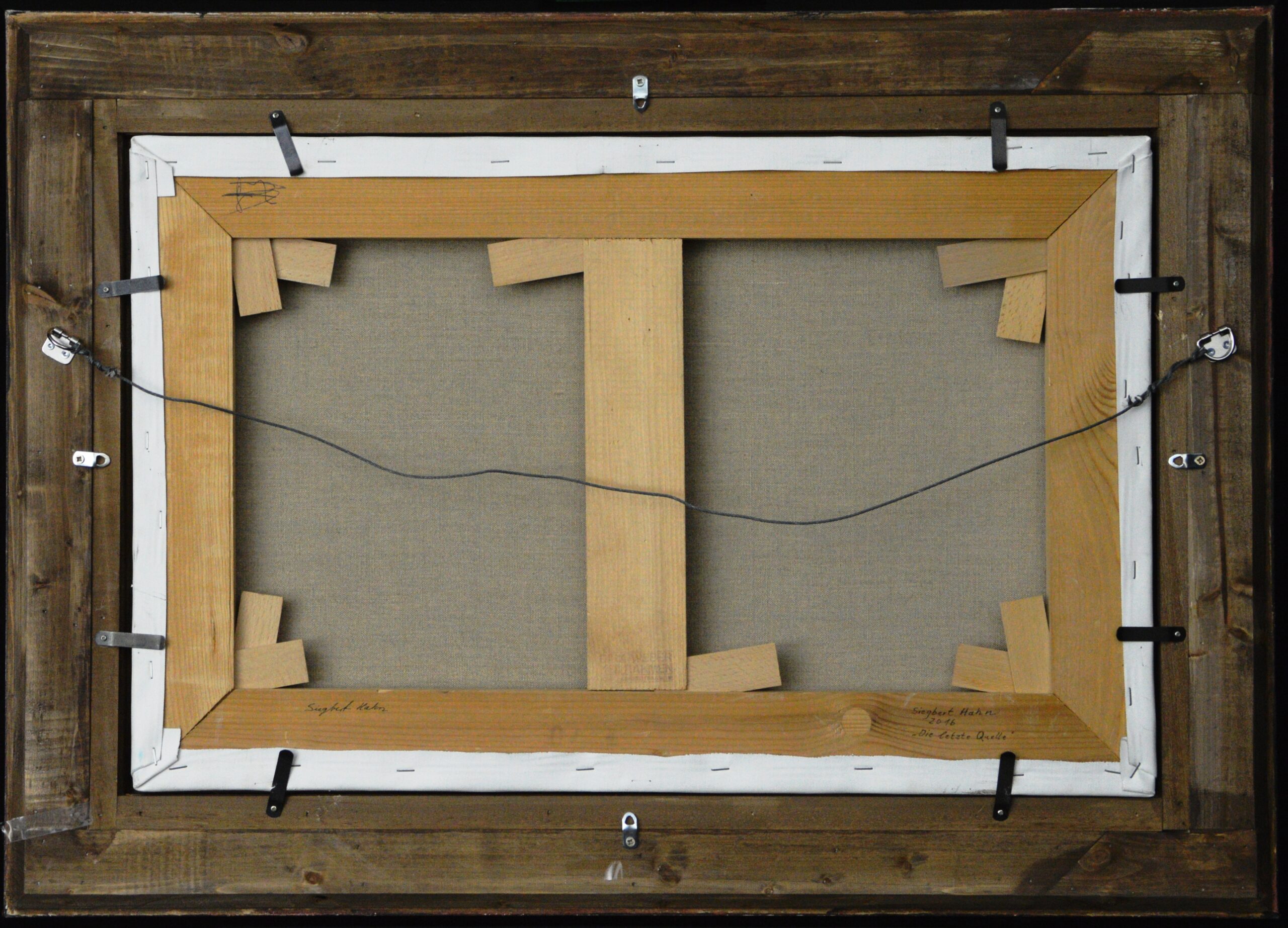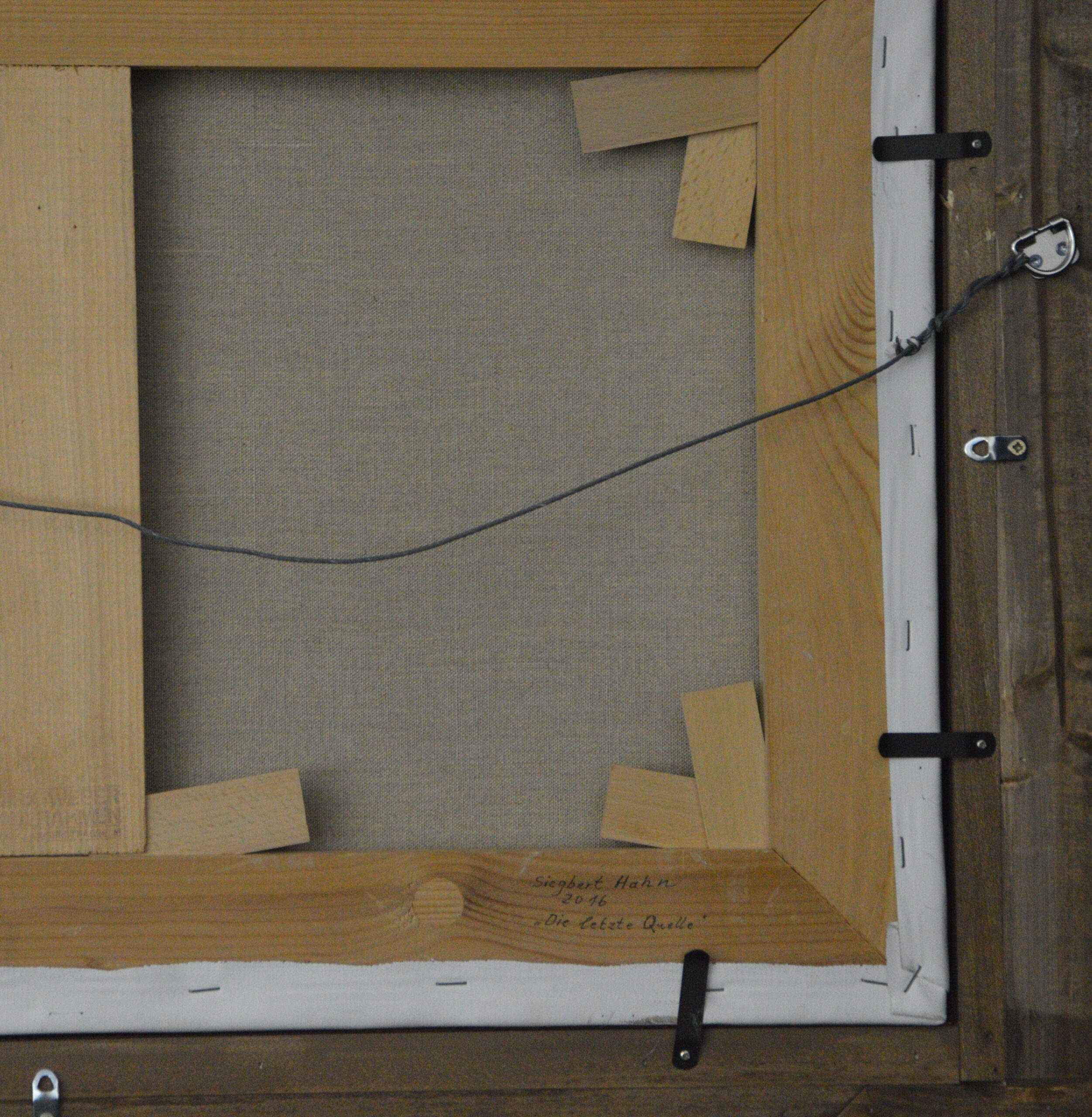 Das Ölgemälde „Die letzte Quelle“ wird dominiert durch vier herbstliche Bäume auf einem sehr kleinen Felsplateau. Die Wurzeln der Bäume durchdringen den Felsen und suchen Halt auf diesem Felsplateau. Die Quelle fliesst über zwei Stufen aus dem Felsen in die trostlose Felsenlandschaft. Der Sturm lässt die Blätter der Bäume durch das Bild fliegen. Das Gemälde hat einen einzelgefertigten Modellrahmen und ist auf der Vorder- und Rückseite datiert und signiert.