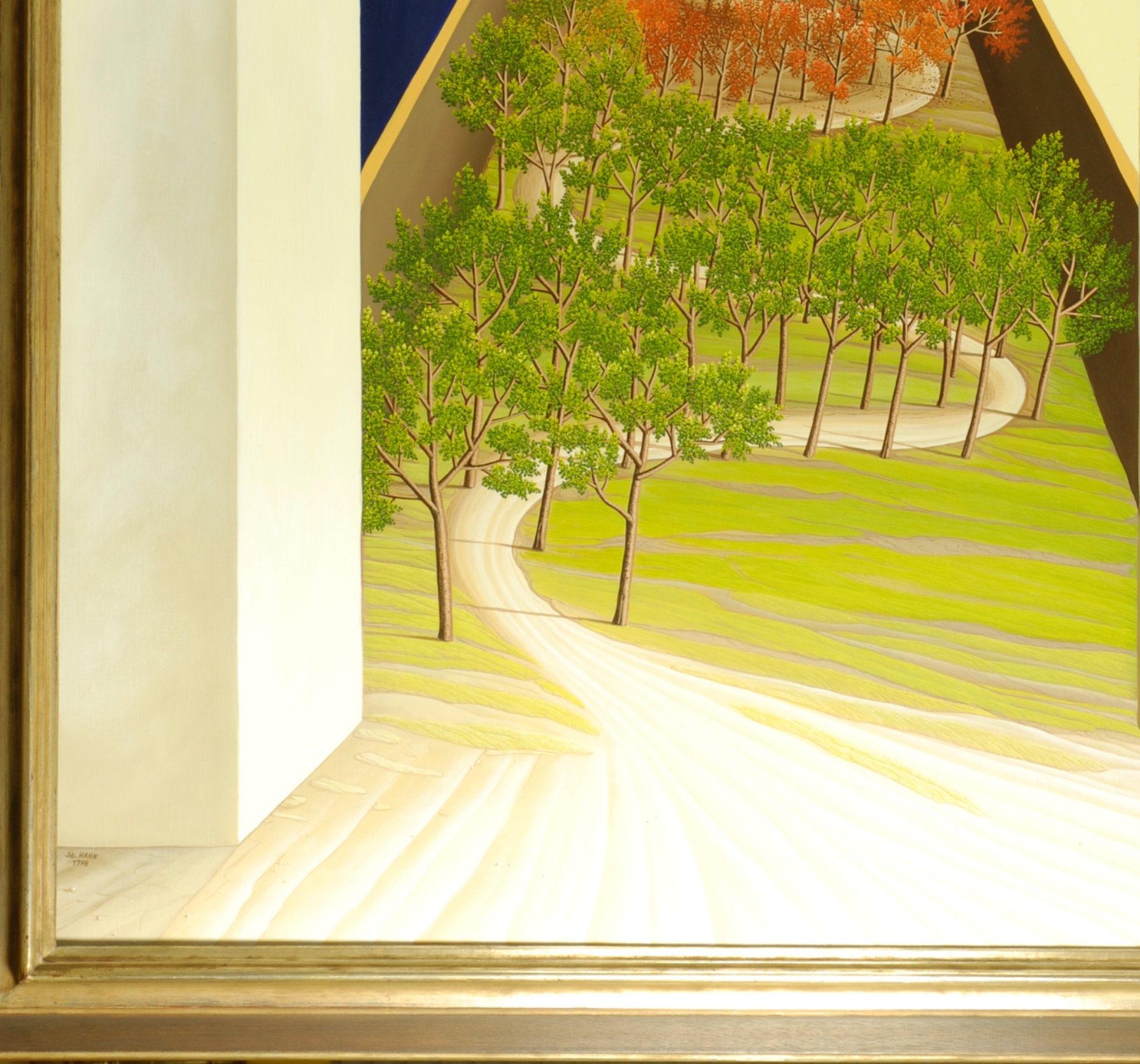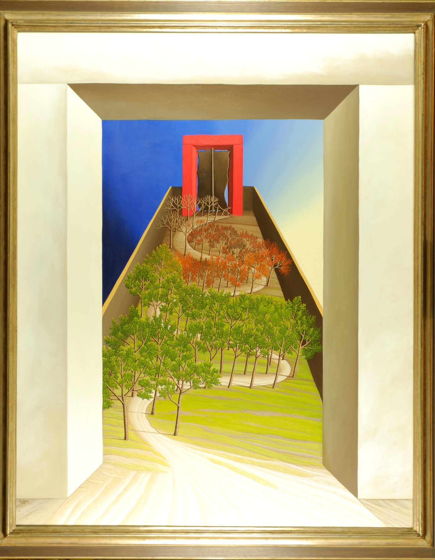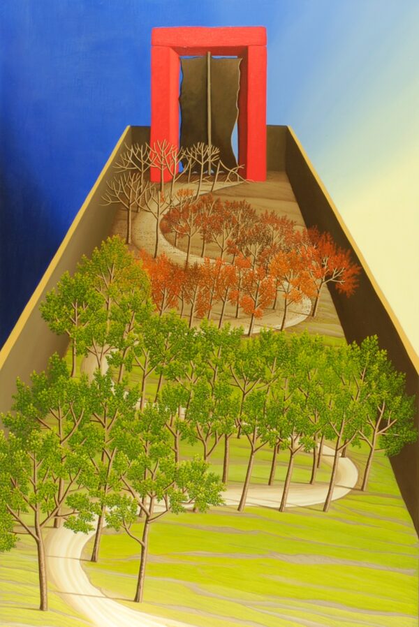 Im Zentrum des Bildes steht das weisse Tor, welches symbolisch für das beginnende Leben steht. Hinter dem Tor beginnt ein langer Weg in eine eingeschränkte, sichtbare Wirklichkeit. Der Weg mit seinen sich jahreszeitlich verändernden Bäumen, ist als Allee angeordnet. So wird der Gang entlang dieses Weges zum Sinnbild für den Gang durchs Leben. Am Ende kündigt sich das Ende durch die herbstlichen Bäume und das fallende Laub an. Der Weg mündet im letzten Tor. Niemand kann erahnen, was danach kommt, sofern überhaupt etwas danach kommt. Das Ölgemälde hat einen einzelgefertigten Modellrahmen und ist auf der Rückseite betitelt, datiert und signiert.