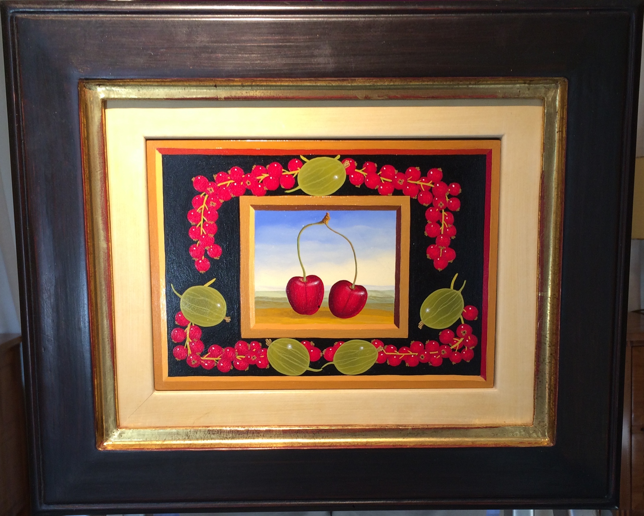 Im Zentrum des Bildes stehen zwei Kirschen vor einer sommerlichen Landschaft. Flankiert wird das innere Bild von fünf Stachelbeeren und roten Johannisbeeren. Der Titel des Gemäldes assoziiert ein menschliches Paar, welches glücklich ist. Das Obst wurde in Originalgrösse gemalt und wirkt dadurch sehr realistisch. Der schwarze Hintergrund lässt die flankierten Früchte erstrahlen. Das Gemälde hat einen einzelgefertigten Modellrahmen mit Passepartout. Der Künstler hat das Gemälde auf der Rückseite betitelt, datiert und signiert.