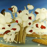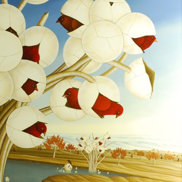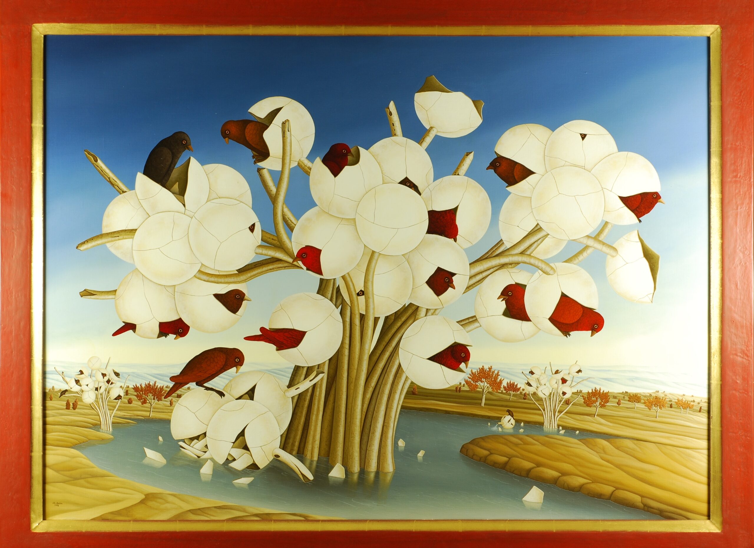 Im Mittelpunkt des Bildes steht ein Phantasie-Baum mit großen weißen Kugelfrüchten. Aus diesen Kugeln, die wie Eierschalen aufbrechen, schlüpfen zahlreiche Vögel mit Gefieder in unterschiedlichen Farben. Der Baum steht in einem seeähnlichen Gewässer in einer Phantasie-Landschaft. Zwei weitere Exemplare dieses Baumes stehen in kleinerer Form am Uferrand. Das Ölgemälde hat einen einzelgefertigten Modellrahmen im gotischen Still mit Applikationen von Blattgold. Das Ölgemälde und ist auf der Vorder- und Rückseite datiert und signiert. Die Abmessungen des Gemäldes mit Rahmen sind: 94 x 124 cm (Höhe x Breite).