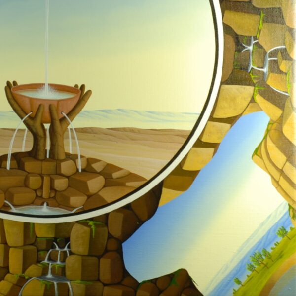 Das Gemälde ist als klassisches Tondi angelegt. Im Mittelpunkt des Tondos steht eine Wasserschale in der sich das Wasser, welches aus dem Nichts kommt, sammelt. Die von Händen getragene Schale fliesst in die umliegende Landschaft. Das Tondo wird von Felsformationen mit Wasserquellen getragen. Das Gemälde hat einen einzelgefertigten Modellrahmen und ist auf die Vorder- und Rückseite signiert und datiert.