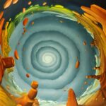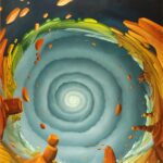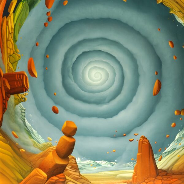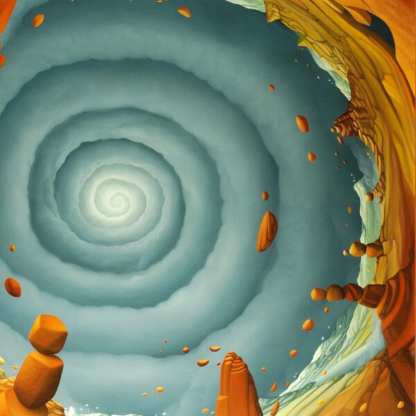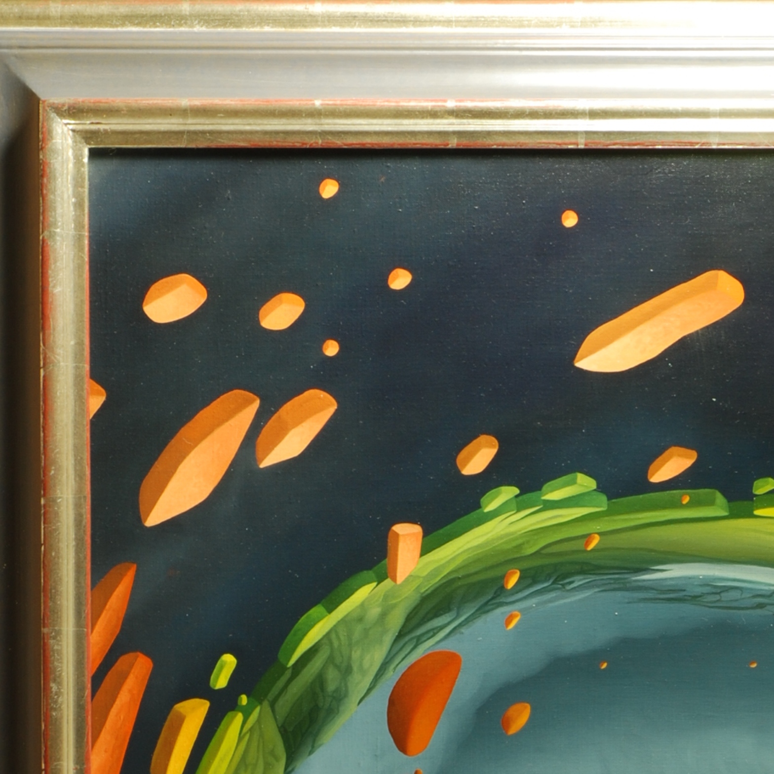 Im Mittelpunkt des Bildes steht ein grosser Wirbel. Die blau-grauen Wolken ziehen die umliegenden Steine und Felsen an und tragen sie im Wirbel davon. Sogar die umliegende Landschaft scheint sich dem Sog des Wirbels zu beugen und richtet sich am Drehmoment des Wirbels aus. Trotz der drohenden Naturkatastrophe, strahlt das Bild eine grosse Ruhe aus. Das Gemälde verfügt über einen einzelgefertigten Modellrahmen.