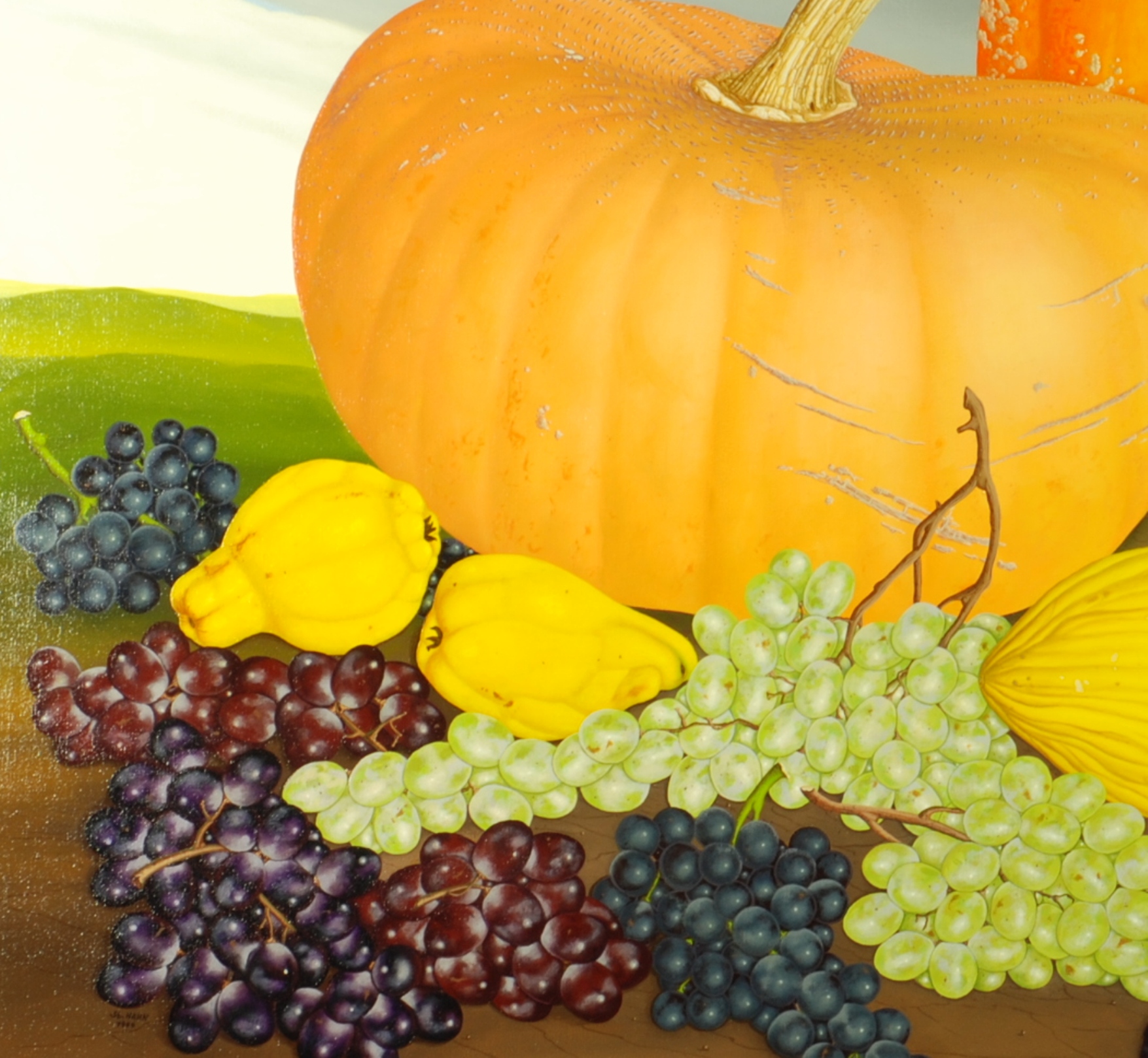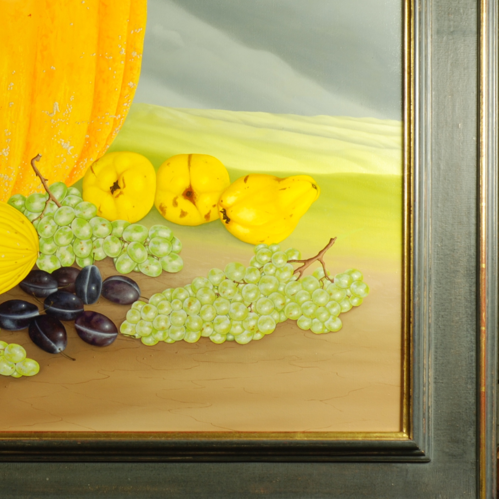 Im Zentrum des Bildes stehen zwei Kürbisse, fünf Quitten, helle und blaue Weintrauben, Pflaumen sowie eine Honigmelone. Die schlicht gemalte Landschaft und der blau-graue Himmel im Hintergrund, lassen das Obst und die Kürbisse sehr plastisch erscheinen. Die Früchte und das Gemüse wurden in Origialgrösse gemalt. Das Gemälde verfügt über einen einzelgefertigten Modellrahmen.