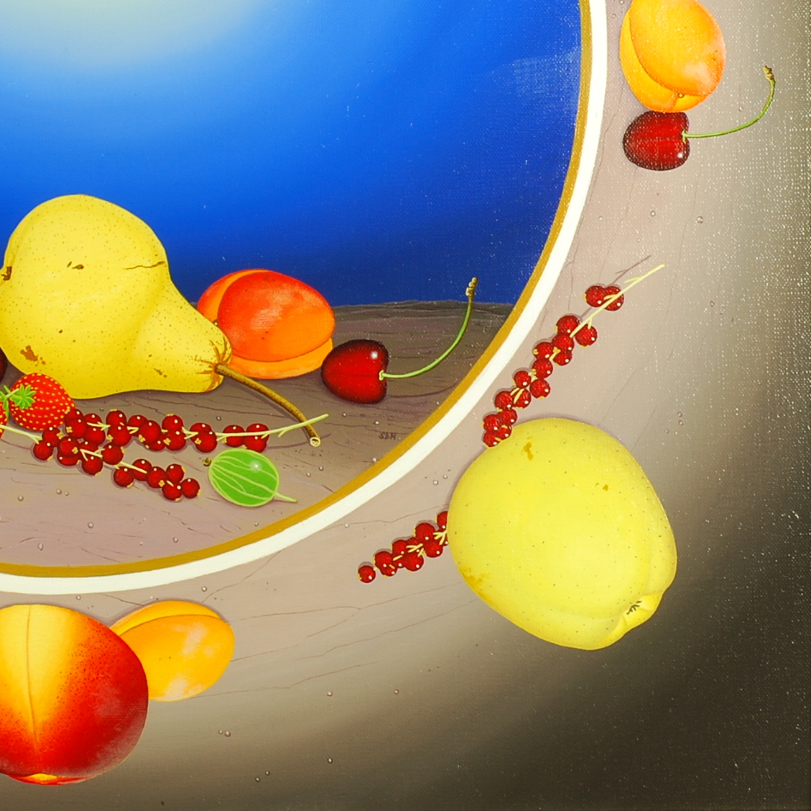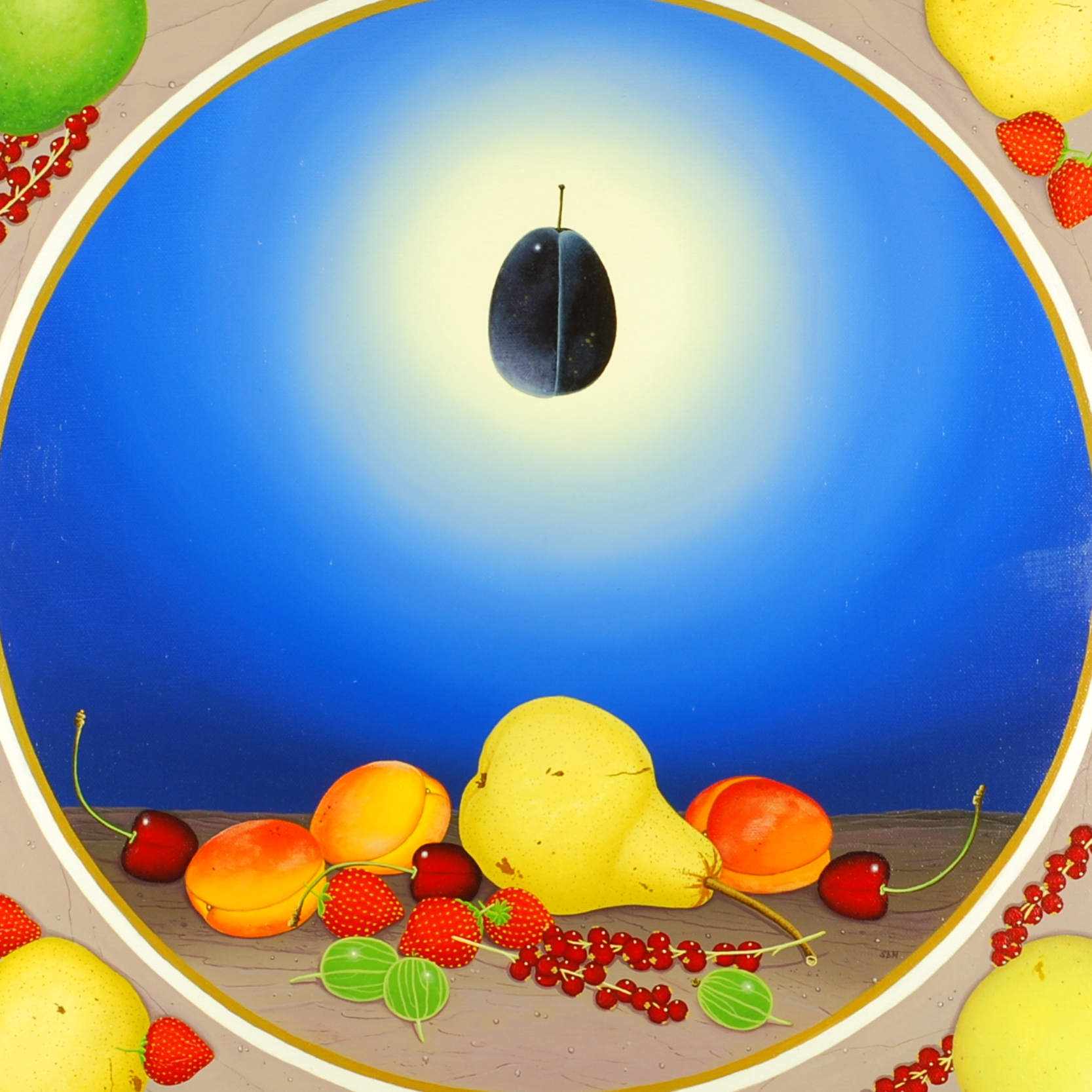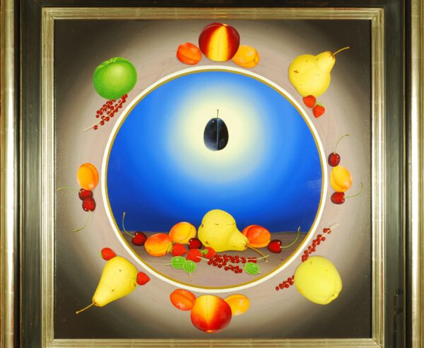 Das quadratische Gemälde, in das ein kreisförmiges Bild (Tondo) hineingemalt wurde, präsentiert eine Pflaume in strahlendem Licht vor einem blauen Himmel. Unten auf der Erde befinden sich andere Obstsorten (Birne, Aprikose, Stachelbeeren, Johannisbeeren, Kirschen) die auf die schwebende Pflaume aufzublicken scheinen. Rings um das Tondo sind zusätzliche Obstsorten drapiert, die allesamt das Rundbild mit der Pflaume einrahmen. Das Gemälde hat einen einzelgefertigten Modellrahmen mit Applikationen aus Blattgold und ist auf der Rückseite datiert und signiert.
