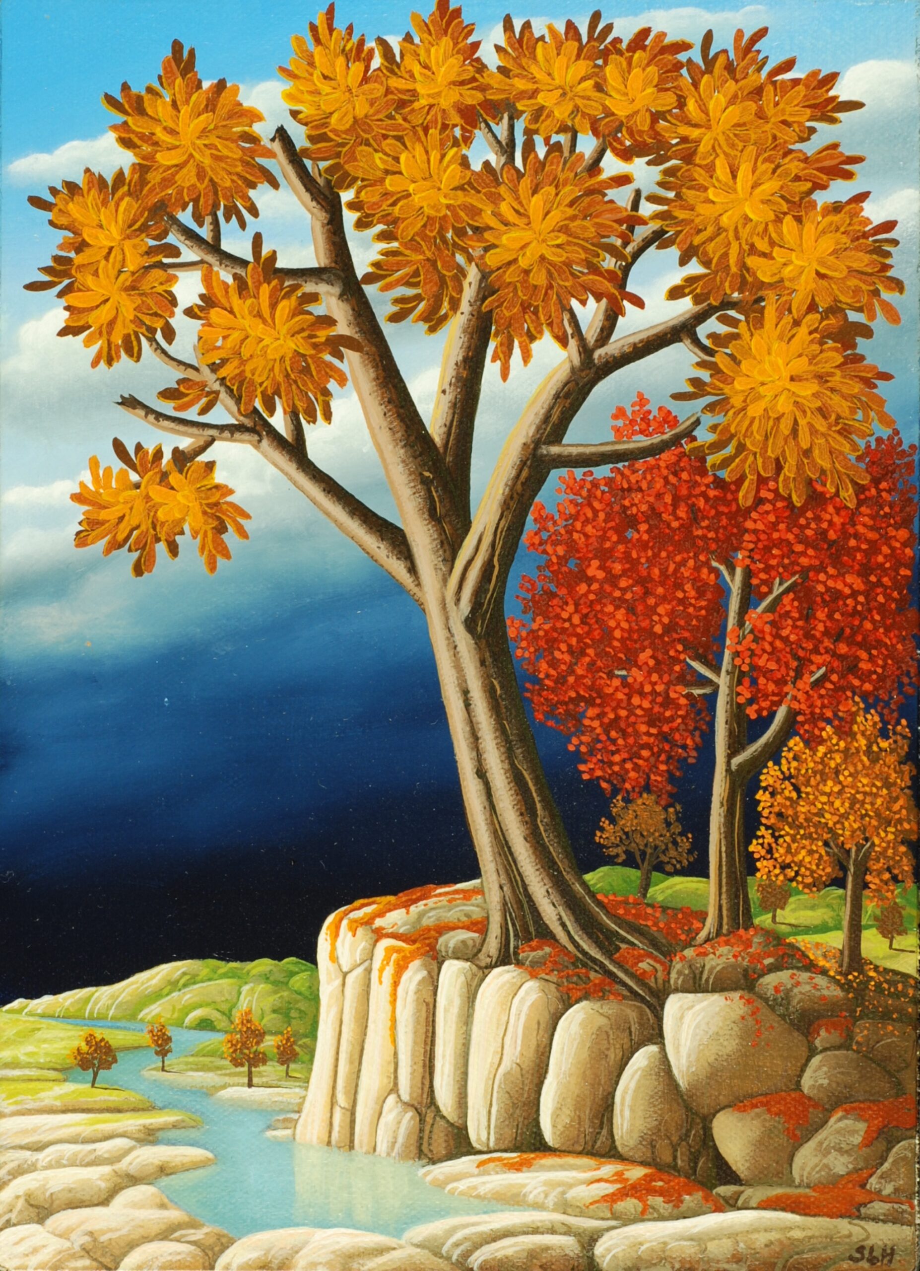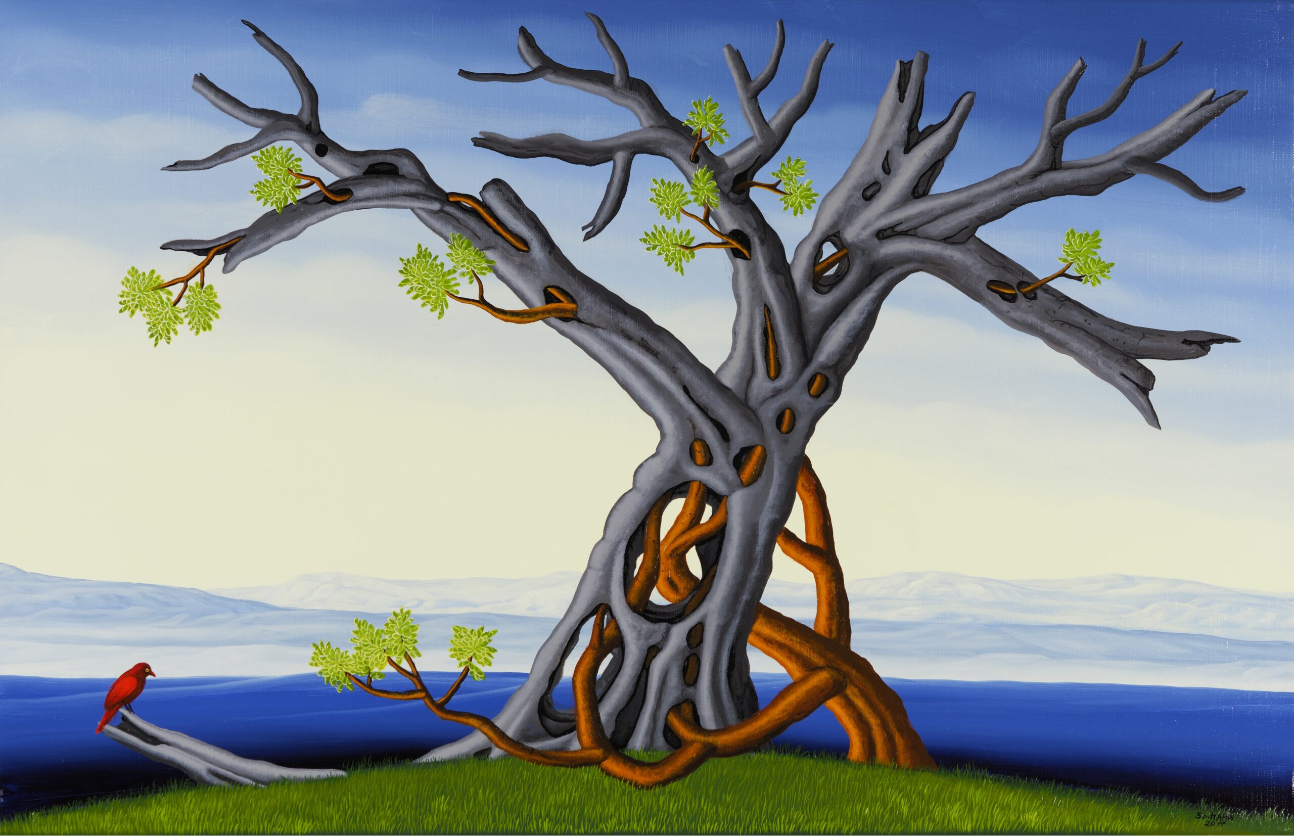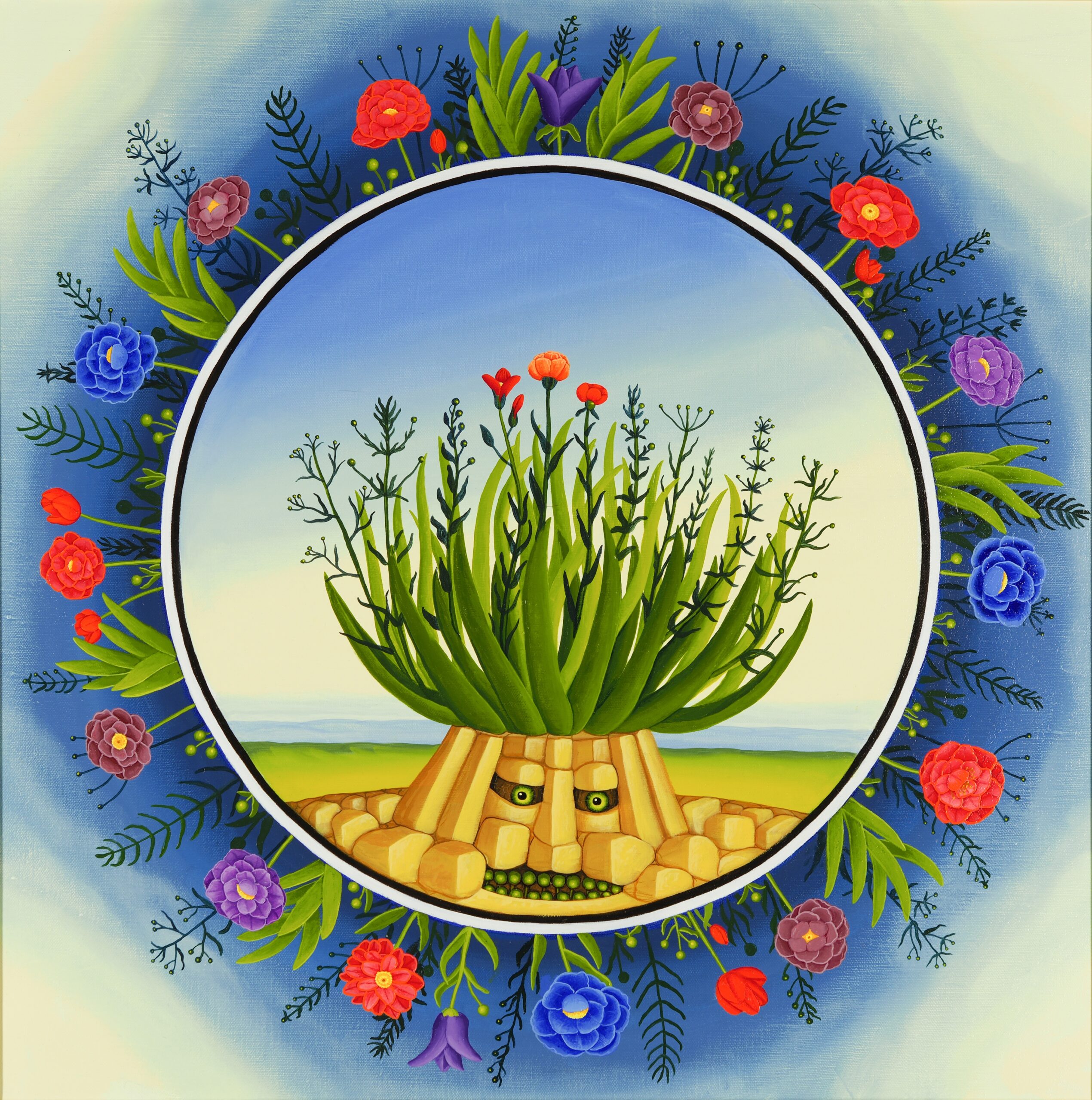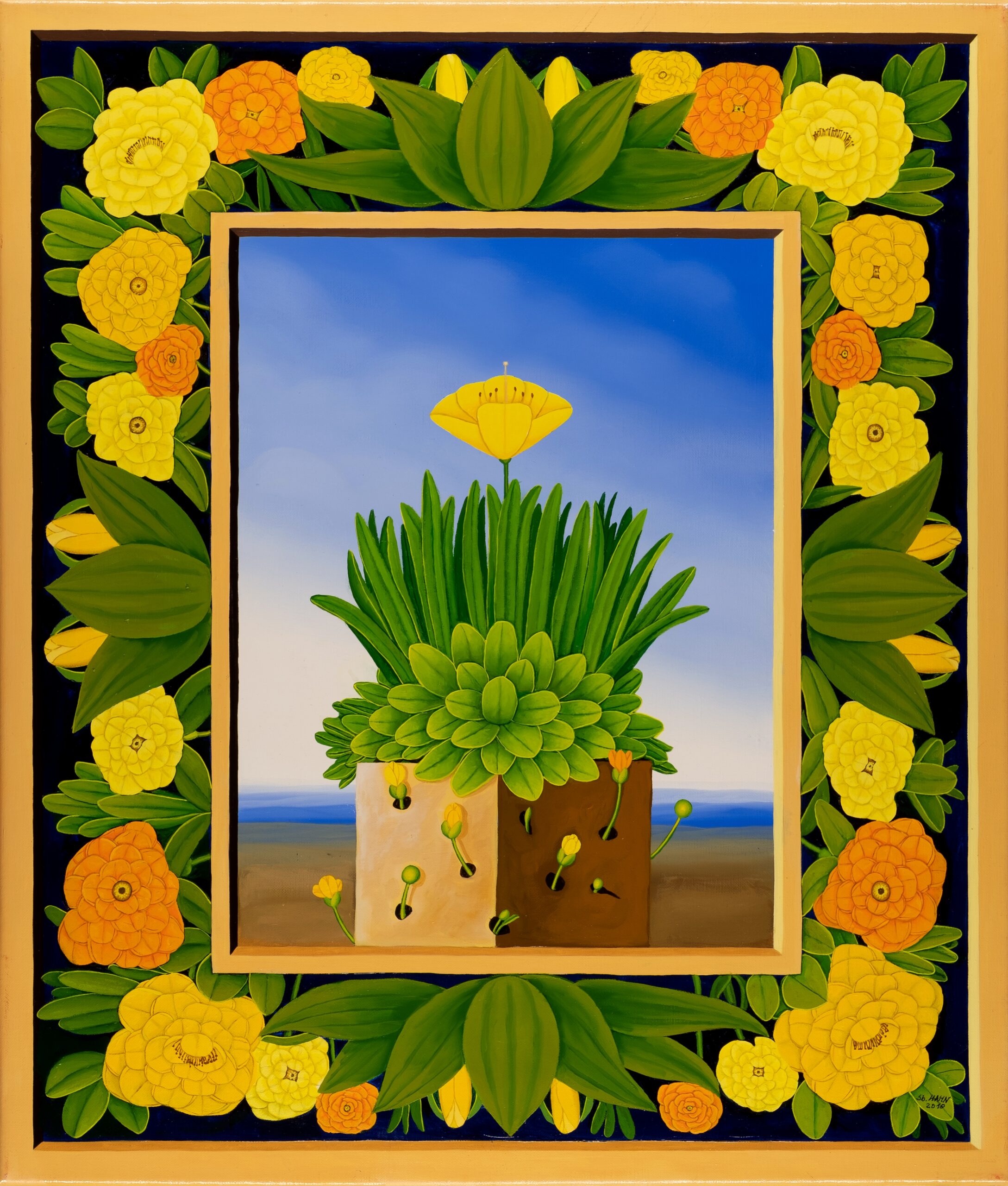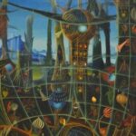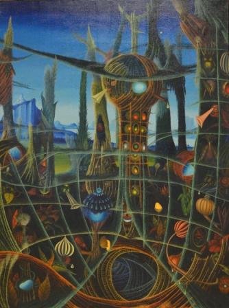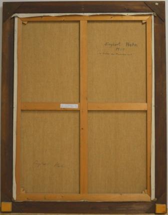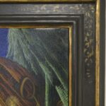 Dieses phantastisch-phantasievolle Gemälde erscheint uns rätselhaft und hintergründig. Seine Aussage entschüsselt sich nicht einem flüchtigen Blick: Wir sehen unbekannte Landschaften mit Höhlen und fremdartigem Getier, eine unvergleichliche Komposition aus Vegetabilem und Animalischem. Das Gemälde bietet nicht nur aufgrund seiner Größe immer wieder Unbekanntes zu entdecken, sondern auch durch den Reichtum abwechslungsreicher Details. Das Ölgemälde verfügt über einen einzelgefertigten Modellrahmen und hat Applikationen von Blattgold. Das Werk ist auf der Rückseite betitelt, datiert und signiert.