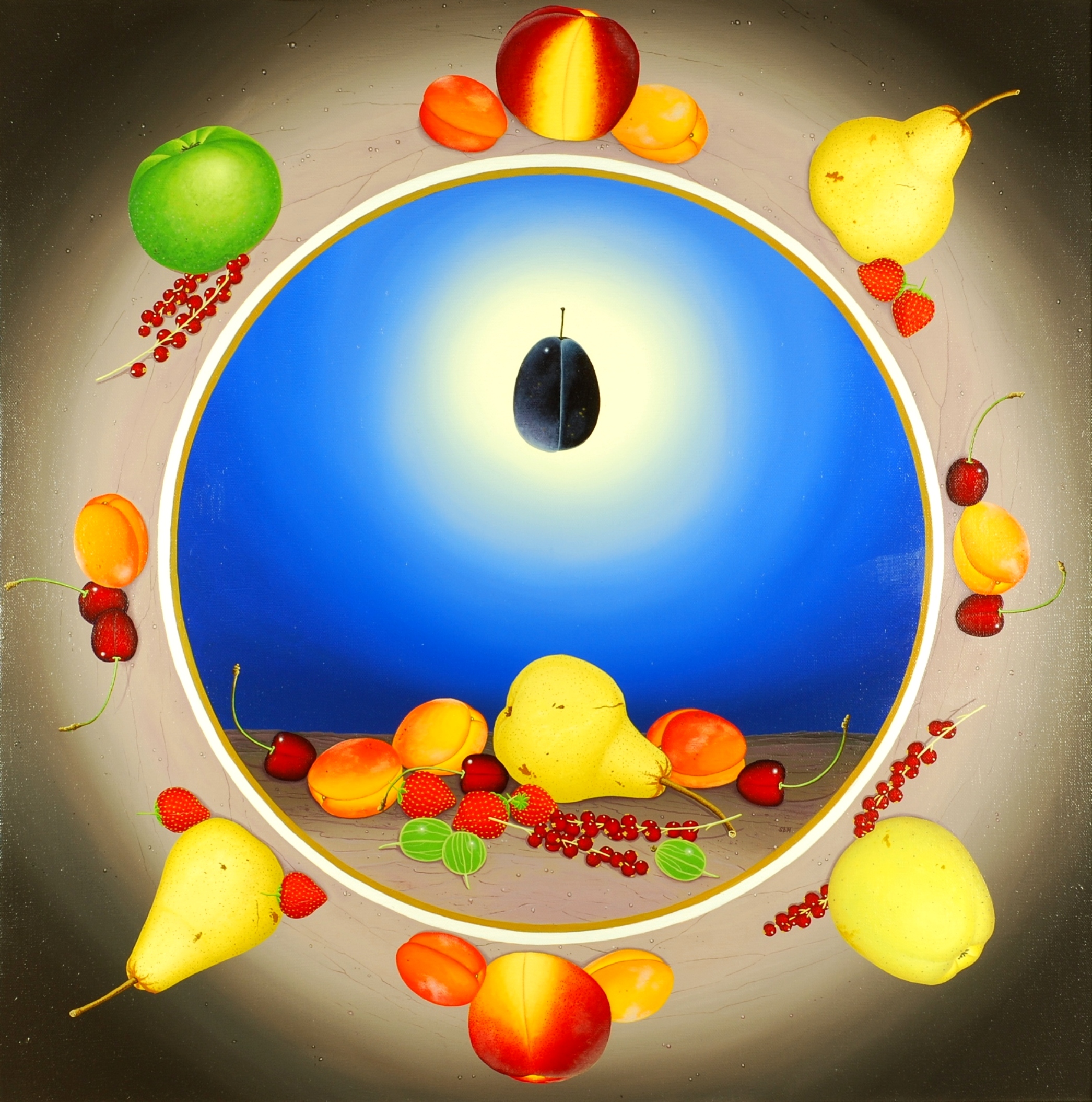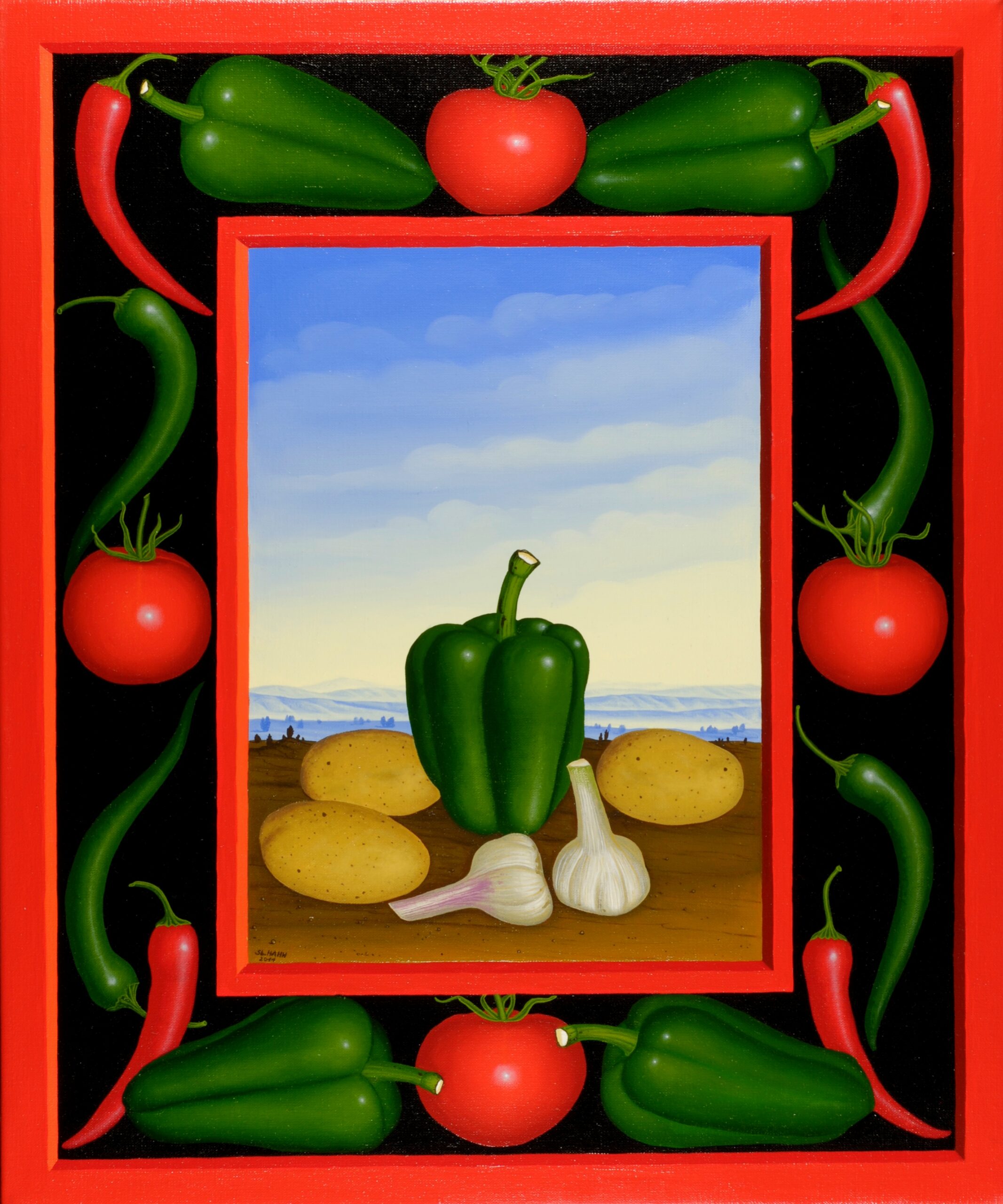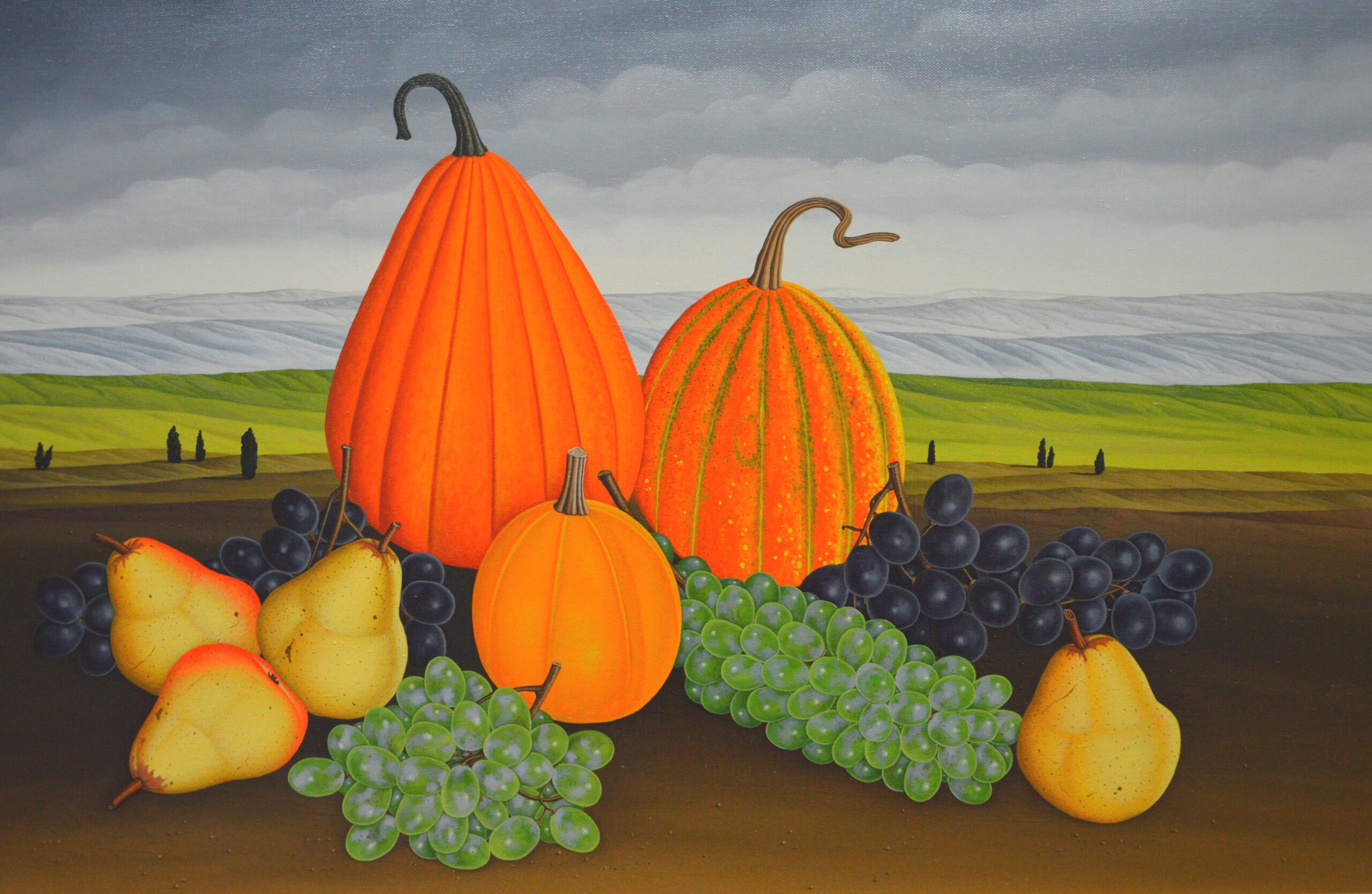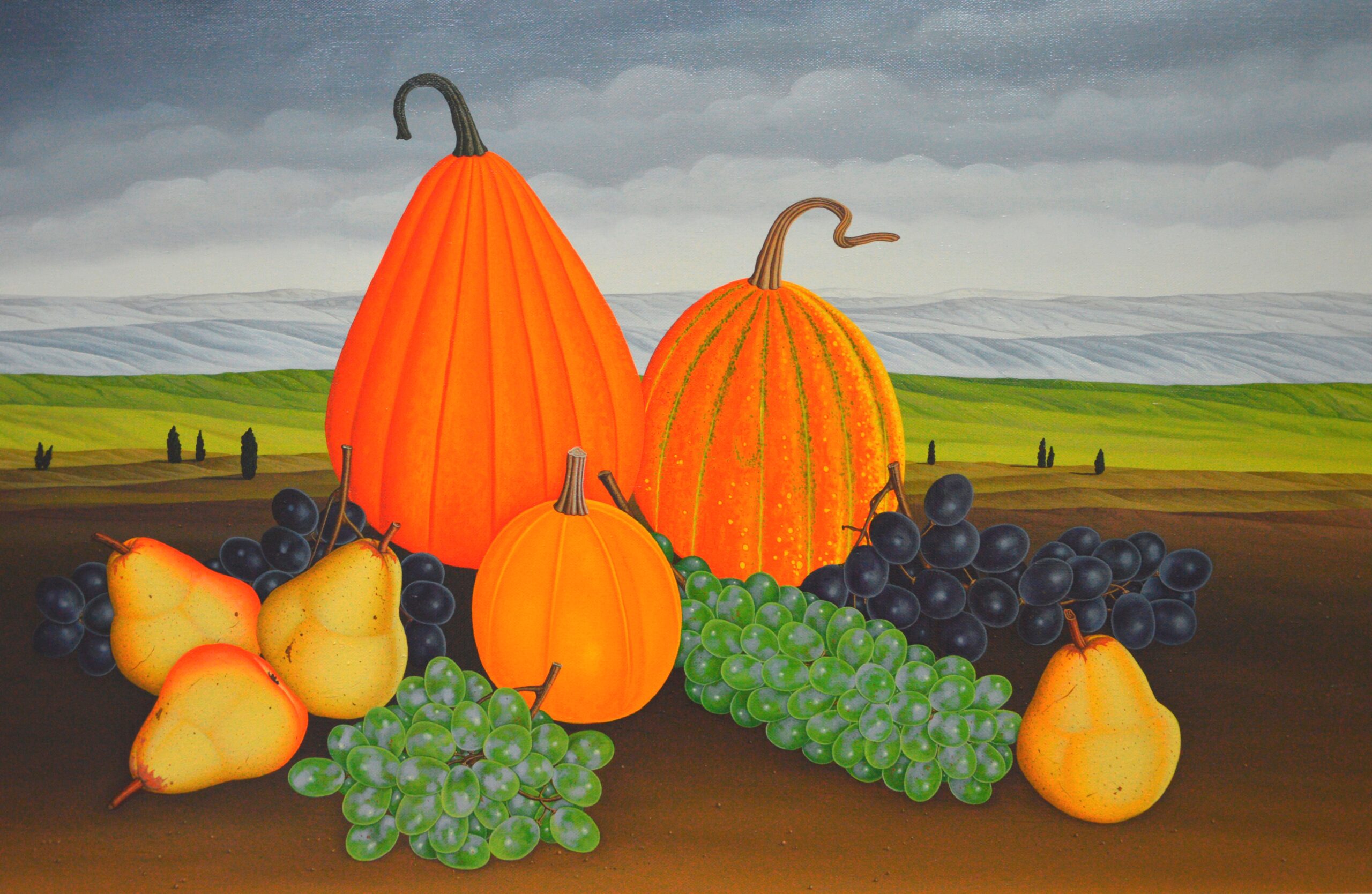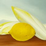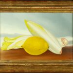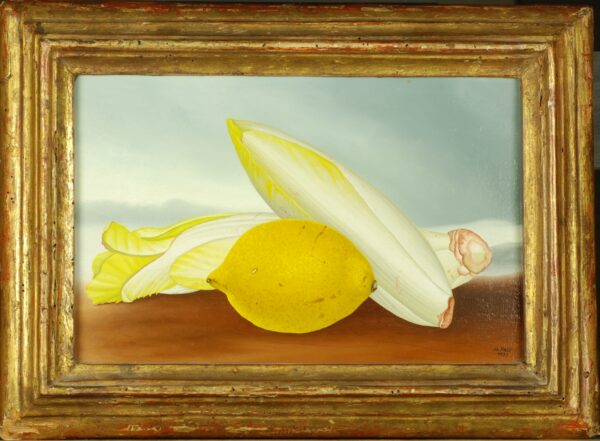 Das Winterstilleben mit Chicorée und Zitrone ist realistisch dargestellt. Der Chicorée und die Zitrone werden in ihrer Originalgrösse abgebildet. Die einfache Darstellung der Landschaft und des gräulichen Himmels setzen die Früchte in Szene. Chicorée und Zitrone spielen die Hauptrolle in diesem Bild. Das Gemälde verfügt über einen originalen alten wurmstichigen komplett blattvergoldeten Rahmen.