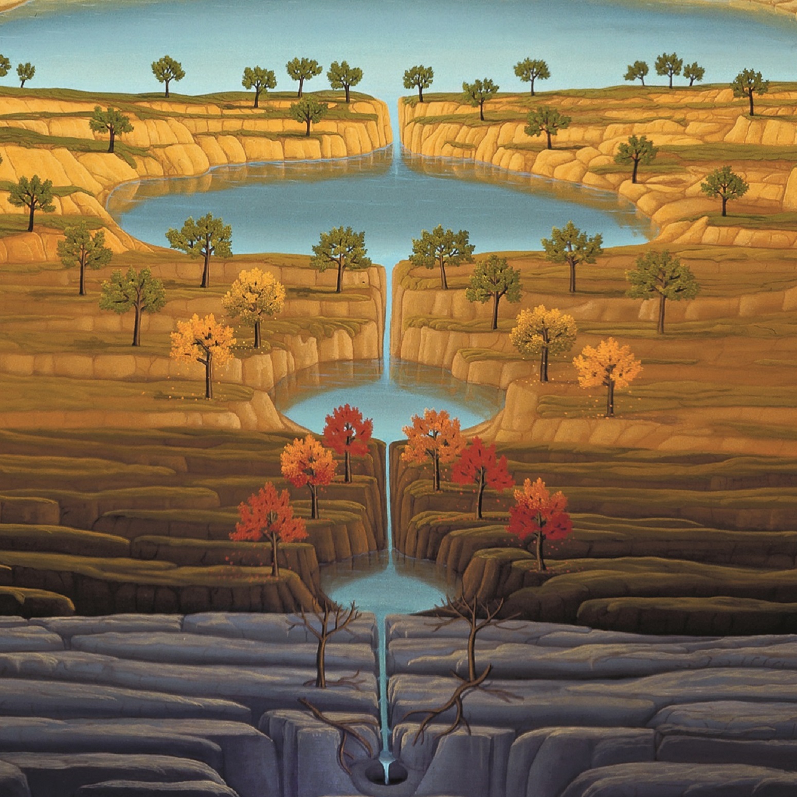 Im Mittelpunkt des Bildes steht eine Seenlandschaft. Die fünf Seen sind miteinander verbunden und das Wasser fliesst von dem hinteren See über die davorliegenden Seen bis in den vordersten See. Am Ufer der Seen stehen Bäume. Das Laub der Bäume verfärbt sich nach den Jahreszeiten. Rund um den letzten See sind die Bäume ohne Laub und zerbrechlich. Das Wasser fliesst zum guten Schluss in ein Loch in der Erde, wo es letztendlich verschwindet. Das Ölgemälde hat einen einzelgefertigten Modellrahmen und ist auf der Vorderseite datiert und signiert.