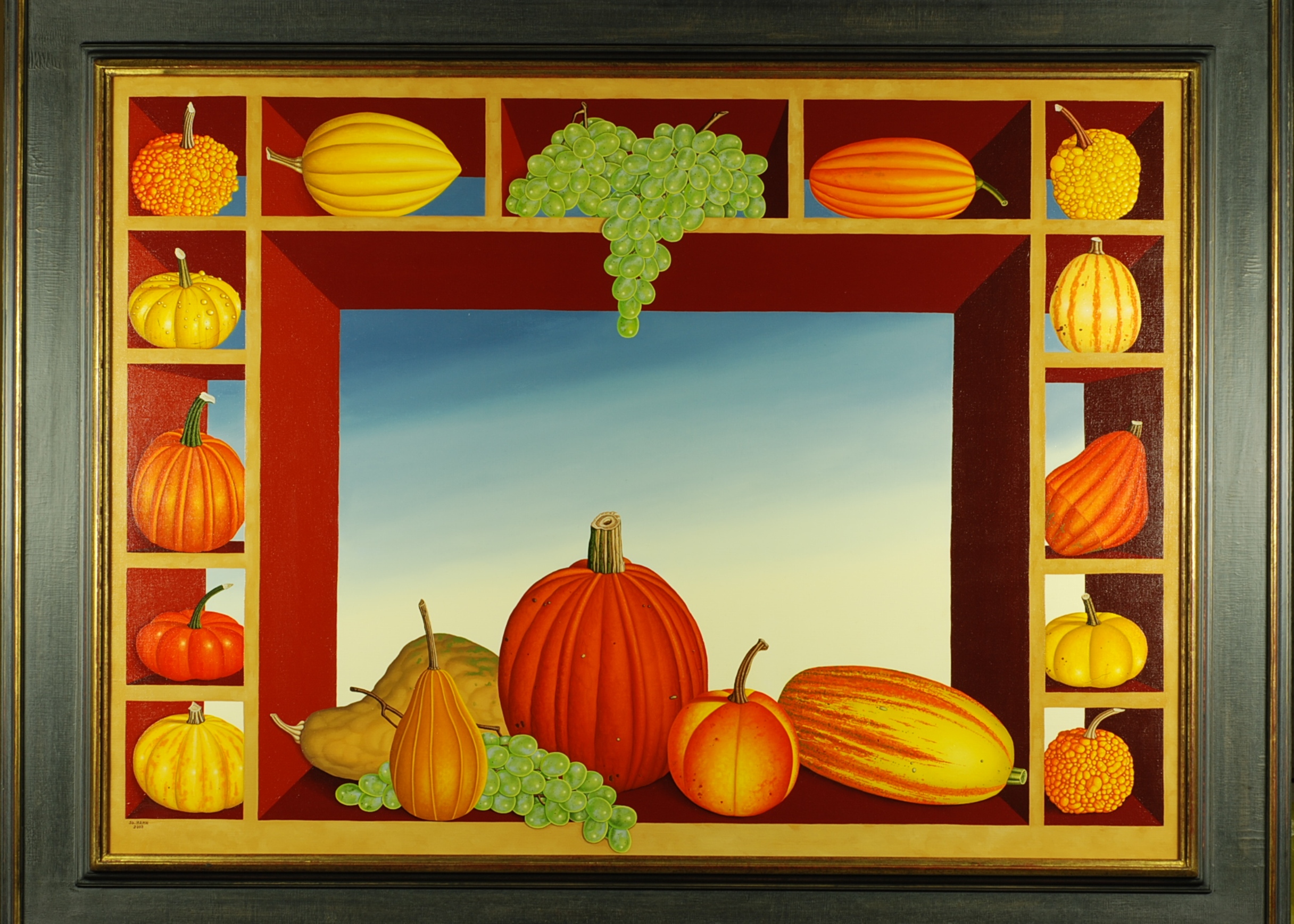 Im Mittelpunkt des Stillebens stehen Pflaumen. Diese Pflaumen werden begleidet von Mirabellen und Reineclauden. Alle Obstsorten werden in Originalgrösse vor einen Landschaft mit blauen Himmel präsentiert. Durch die Darstellung der Früchte in Originalgrösse wirkt das Ölgemälde sehr realistisch für den Betrachter. Das Gemälde verfügt über einen einzelgefertigten Modellrahmen. Das Ölgemälde ist auf der Rückseite datiert, betitelt und signiert.
