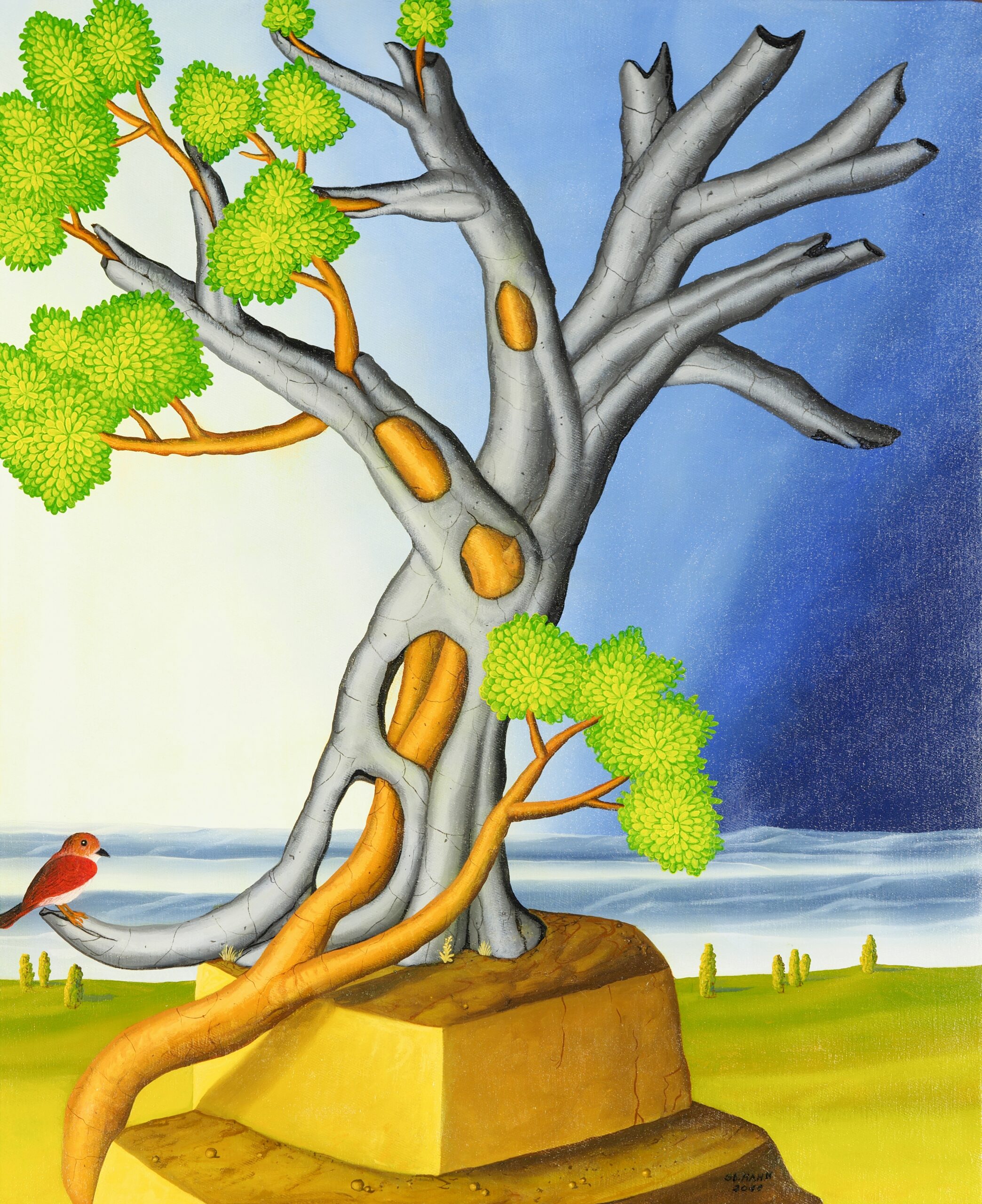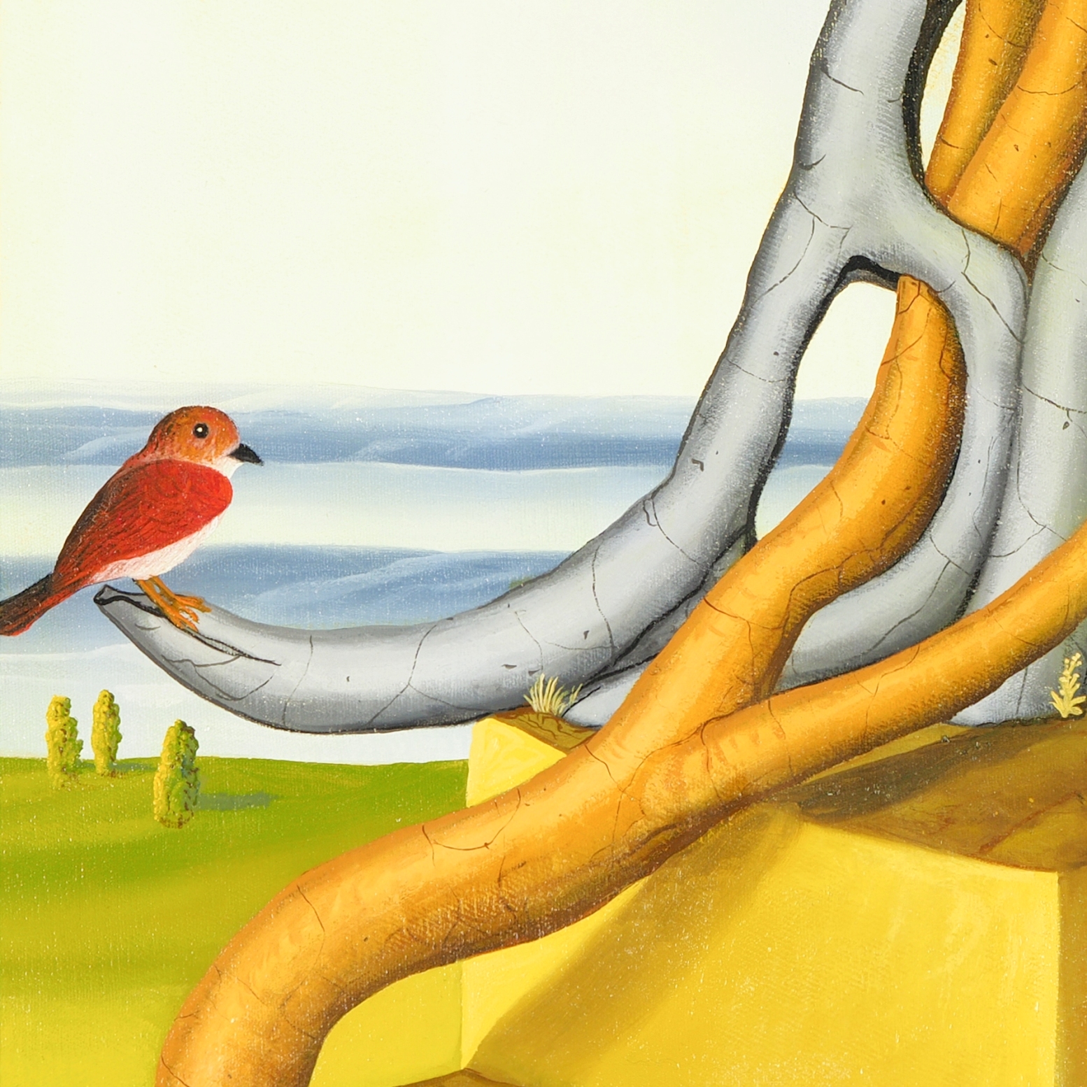Das vorliegende Ölgemälde gliedert sich in zwei Bildhälften. Der obere Teil zeigt uns eine tote Baumlandschaft mit abgestorbenen Bäumen. Der untere Teil des Gemäldes eröffnet uns einen Blick in tieferliefende Erdschichten mit vielen Erdhöhlen, aus denen unterschiedliche Planzen mit Blüten und Trieben wachsen. In einem kleinen Erdloch sitzt sogar ein Vogel, der den Betrachter anschaut. Aus einigen Erdhöhlen schimmert ein helles sowie sonderbares Licht. Das Ölgemälde hat einen einzelgefertigten Modellrahmen und ist auf der Vorder- und Rückseite datiert und signiert.