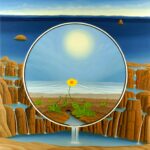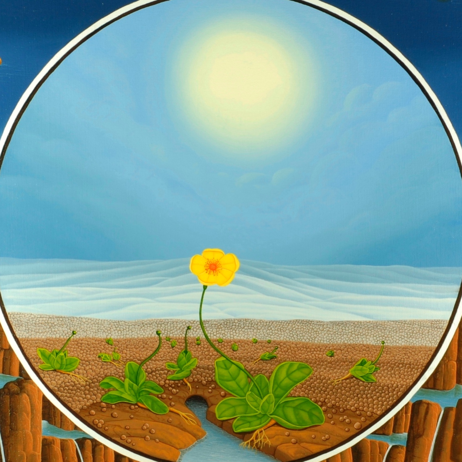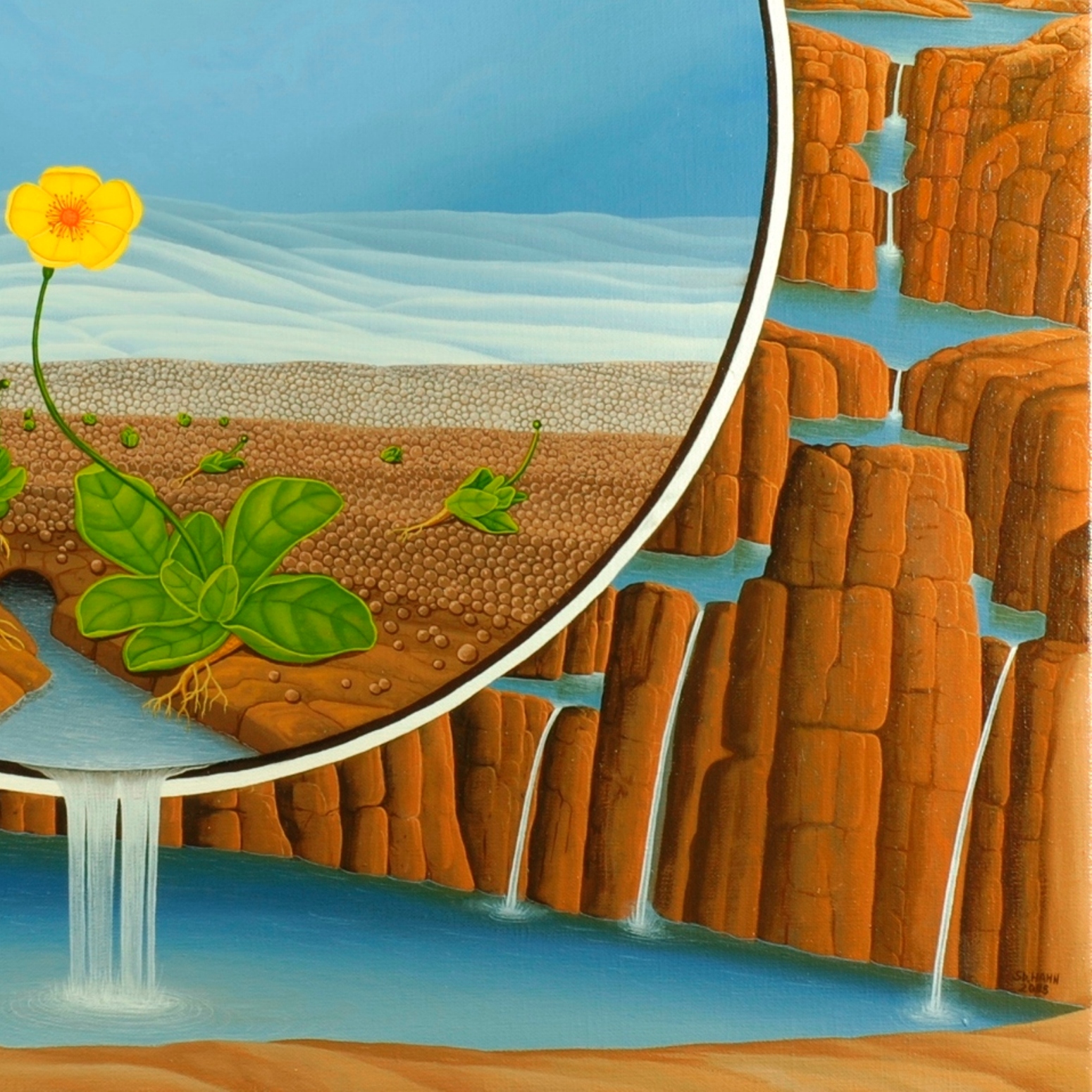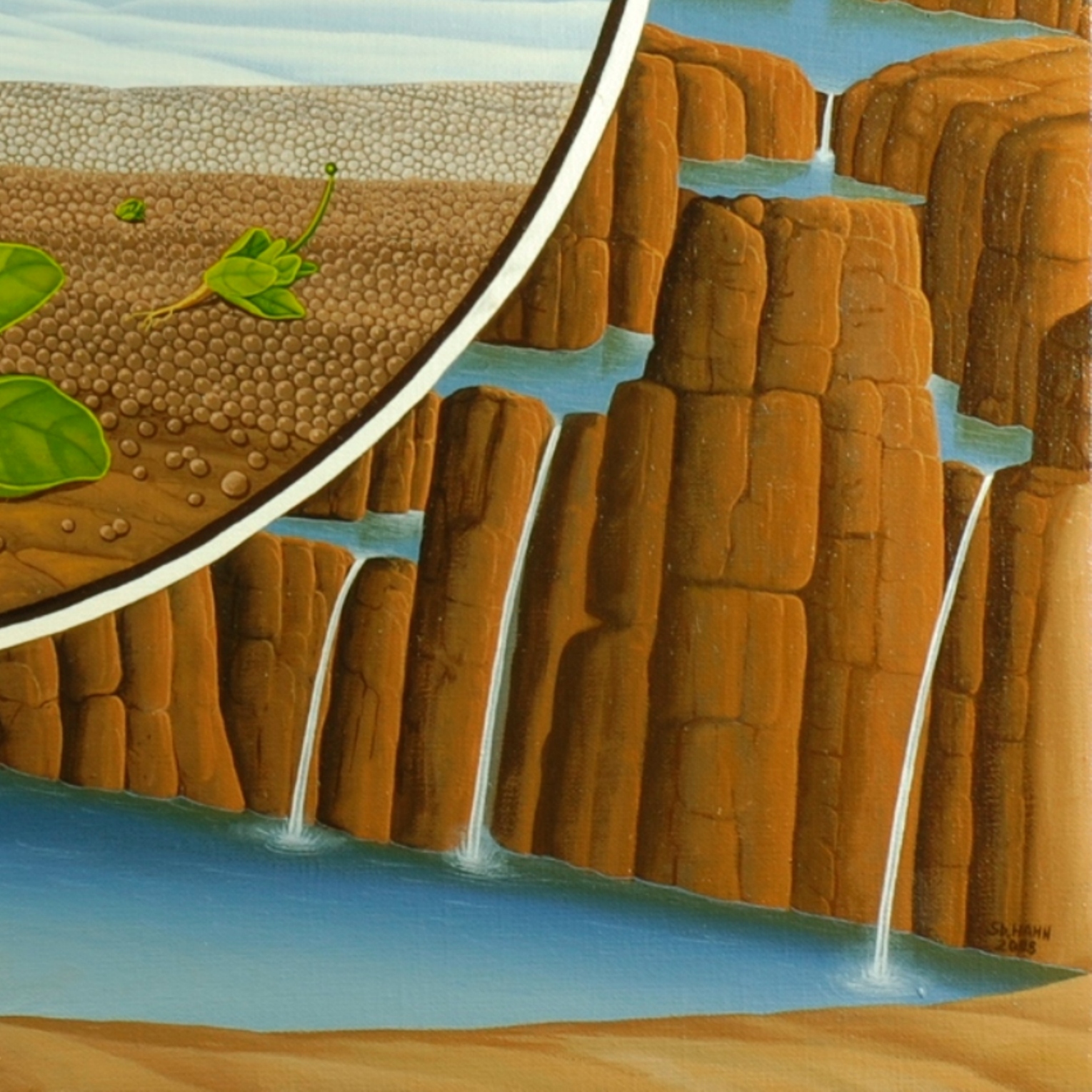 Aus einer Wasserlandschaft fliesst Wasser über eine Felsenformation. Im Zentrum des Bildes schwebt ein Tondo, dass uns einen Bick in einer andere Landschaft / Welt gewährt. Es wachsen Blumen in dem Tondo und es entspringt eine Quelle, dessen Wasser sich in die darunterliegende Landschaft ergiesst. Das Gemälde hat einen einzelgefertigten Modellrahmen mit Applikationen aus Blattgold und ist auf der Rückseite datiert und signiert.