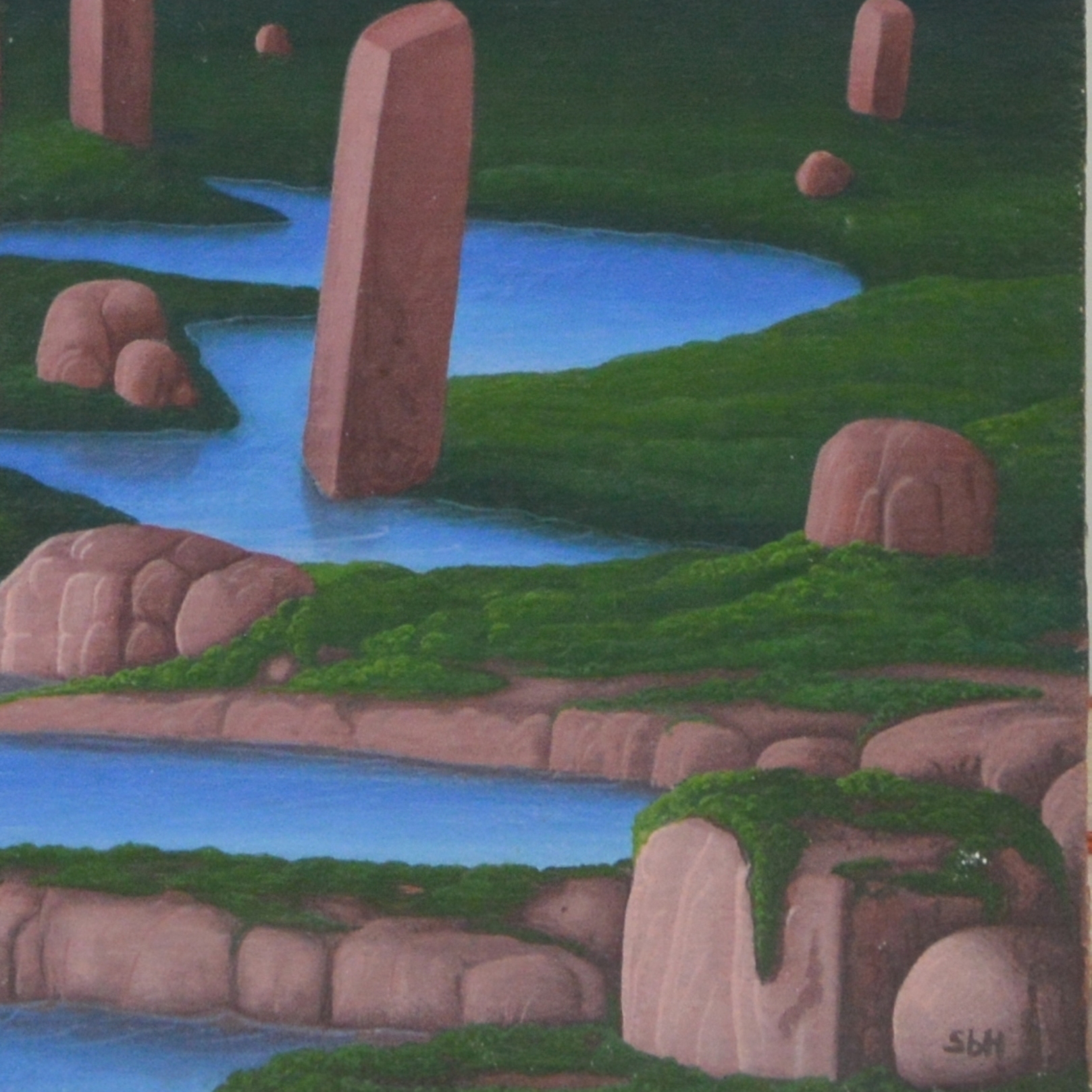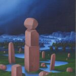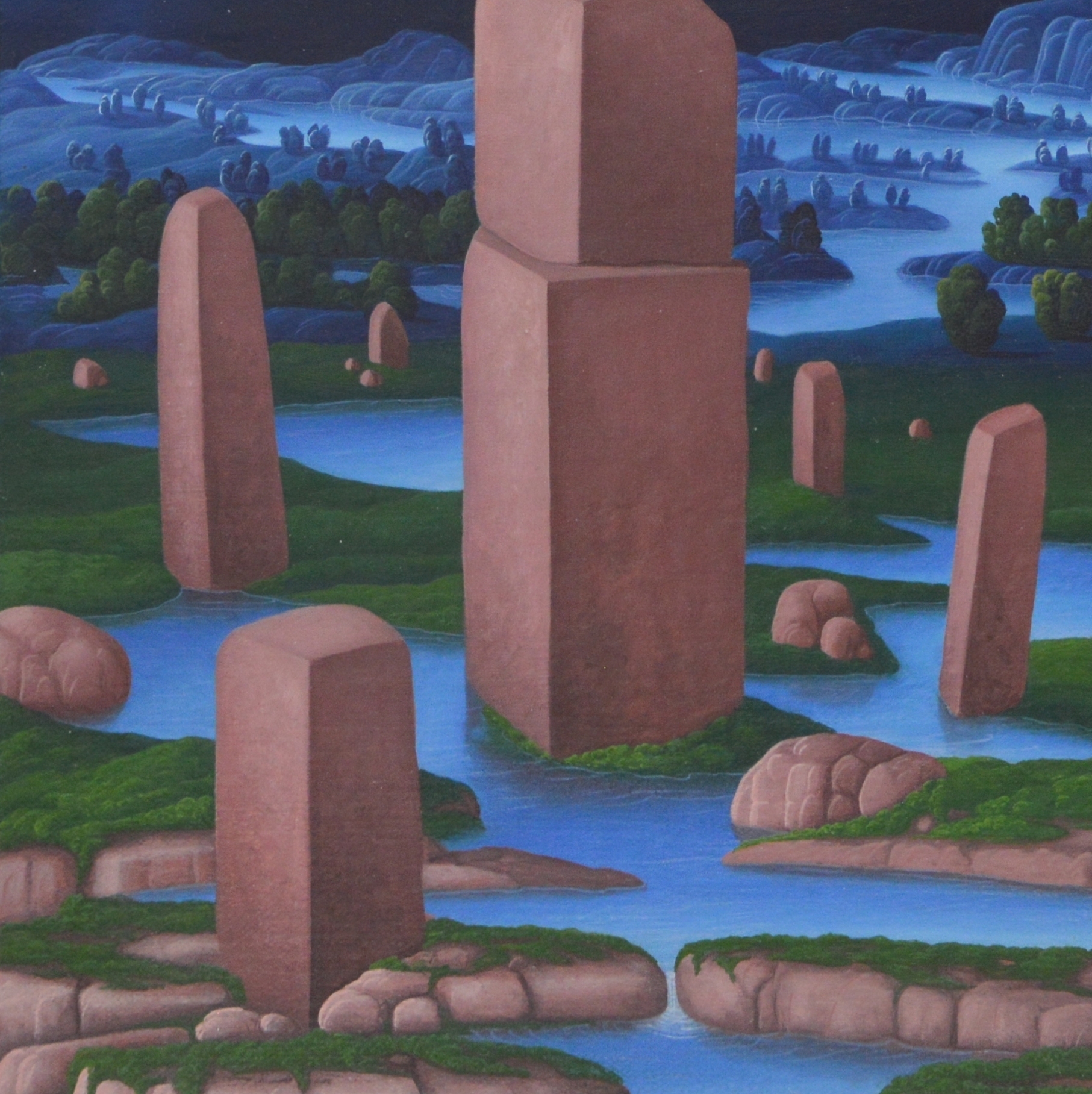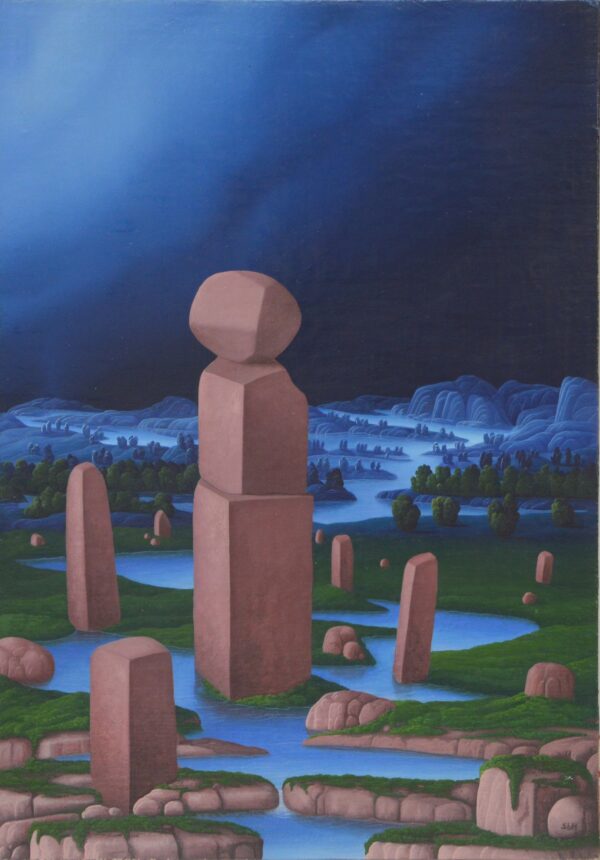 Im Mittelpunkt des Ölgemäldes steht eine grosse und mehrere kleinere Stelen in einer weiten und tiefen Seenlandschaft. Der Fluss, der die Seen speisst, kommt aus der Tiefes des Bildes, in der eine bläuliche Gebirgslandschaft zu sehen ist. Die Felsen der Uferlandschaft sind mit grünen Moosen bedeckt und im Hintergrund mit grünen Sträuchern. Das Gemälde hat einen einzelgefertigten Modellrahmen und ist auf der Vorder- und Rückseite datiert und signiert. Darüber hinaus wurde das Gemälde auf Leinwand auf Holz gemalt.