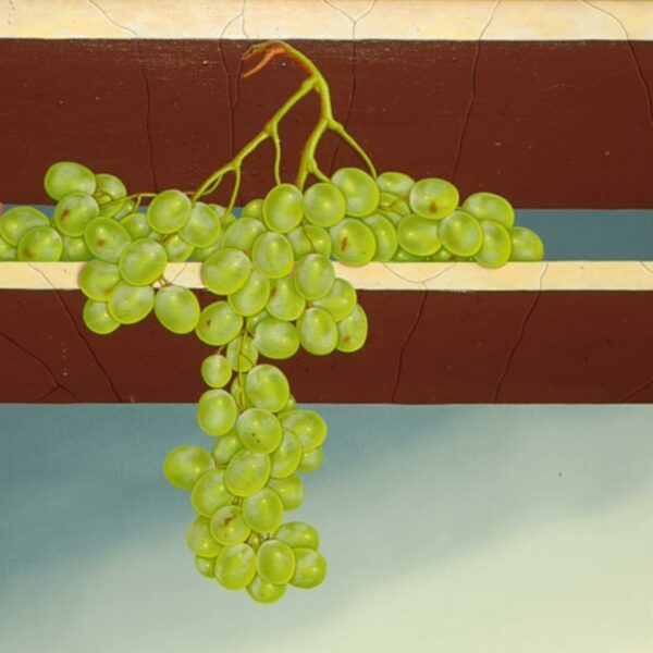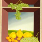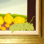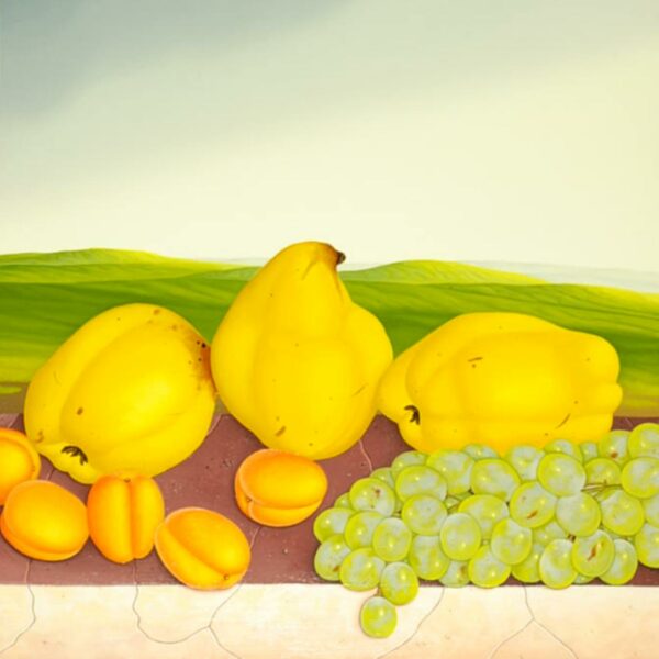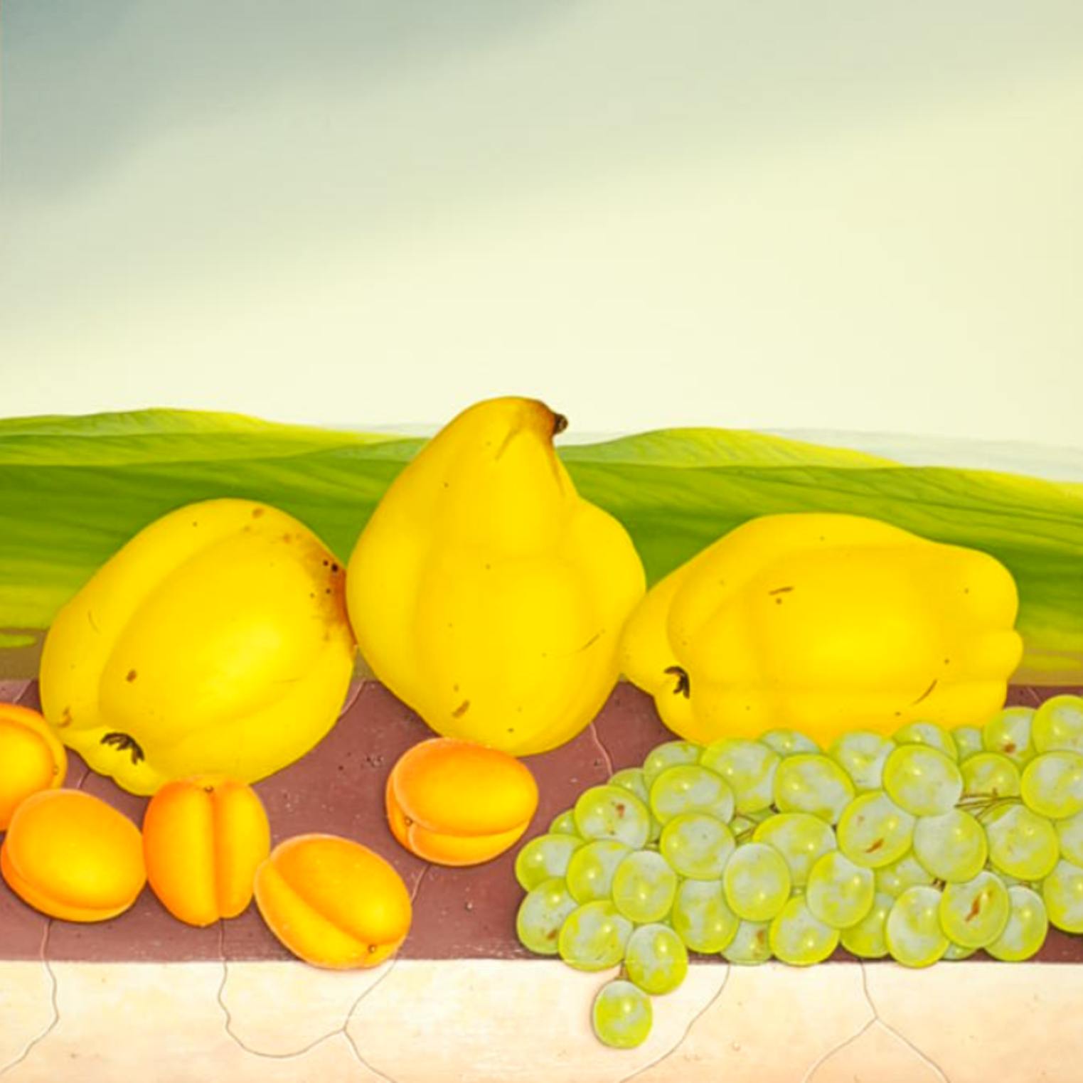 Das Stillleben präsentiert in einem Marmor-Schaukasten auf zwei Ebenen frisches Obst der Jahreszeit. Neben drei Quitten, die dem Gemälde seinen Namen geben, stehen zwei helle Weintrauben und fünf Aprikosen im Mittelpunkt des Gemäldes. Die Weintraube hängt sogar von der zweiten Ebene des Schaukastens herab. Die gemalten Früchte wurden alle in Originalgrösse dargestellt und wirken deshalb sehr realistisch. Durch den Marmor-Schaukasten sieht man eine sommerliche Landschaft. Das Gemälde hat einen Modellrahmen der komplett mit Blattgold vergoldet ist. Die Signatur und die Datierung befindet sich auf der Vorder- und Rückseite.