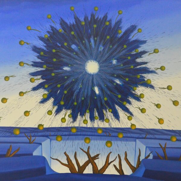 Im Mittelpunkt des Gemäldes stehen ein alter und neuer Baum. Auf einem Felsen steht dieser vertrocknete alte Baum mit einem hohlen Stamm und durchlöcherten Ästen. In diesem abgestorbenen Baum ist ein junger Baum hinein gewachsen und stützt so den alten Baum – und der alte Baum schützt den jungen Baum, bis dieser komplett ausgewachsen sein wird und den alten Baum von innen heraus bersten lässt. Ein kleiner Vogel sitzt auf einer Wurzel am linken Bildrand. Eine sommerliche Landschaft befindet sich hinter den beiden Bäumen. Das Bild verfügt über einen einzelgefertigten Modellrahmen und ist auf der Vorder- und Rückseite signiert und datiert.