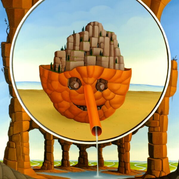Das Bild zeigt ein Tondo (Rundbild), das in einer Grotte zu schweben scheint. Im Zentrum des Tondos befindet sich eine Phantasie-Frucht, aus deren Stiel Wasser in den Vordergrund der Grotte fliesst. Die Frucht hat eine Gesicht ähnelnde Züge (Augen, Mund, Nase). In der oen geöffneten Frucht befindet sich eine Felsenformation, auf der kleine Bäume wachsen. Das Wasser fliesst in die umliegende Landschaft und spendet die Basis für zukünftiges Leben. Das Bild ist gerahmt (einzelgefertigter Modellrahmen) und auf der Vorder- und Rückseite signiert und datiert.