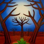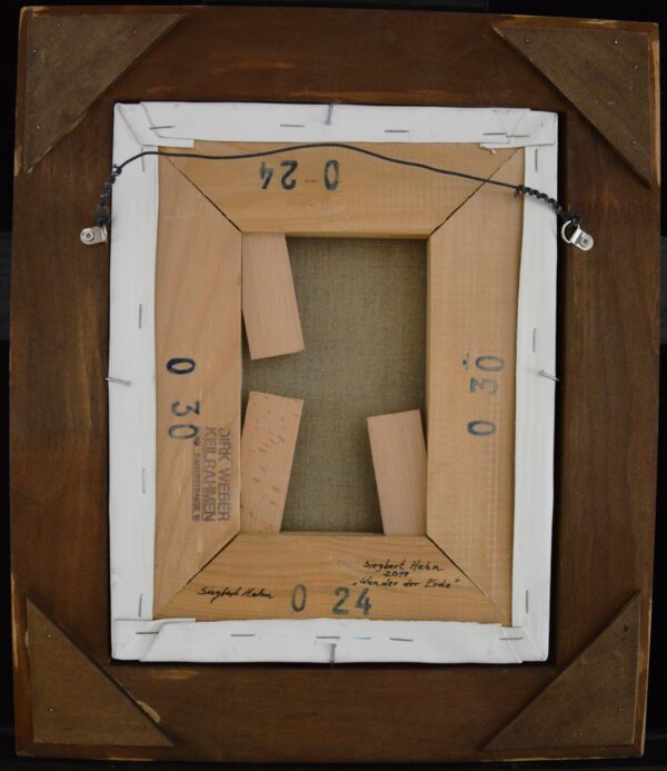 Im Mittelpunkt des Bildes steht eine geheimnisvolle Pflanze mit Blüte, die aus einem leuchtenden Loch im Boden wächst. Die Stimmung des Bildes wird durch die abgestorbenen Bäume um das Loch und im Hintergrund unterstrichen. Die geheimnisvolle Pflanze mit ihrer Blüte verteilt kleine Pollen, die in die Umgebung abgegeben werden. Das helle Licht am Horizont erzeugt eine hoffnungsvolle Stimmung im gesamten Bild. Das Gemälde verfügt über einen einzelgefertigten Modellrahmen.