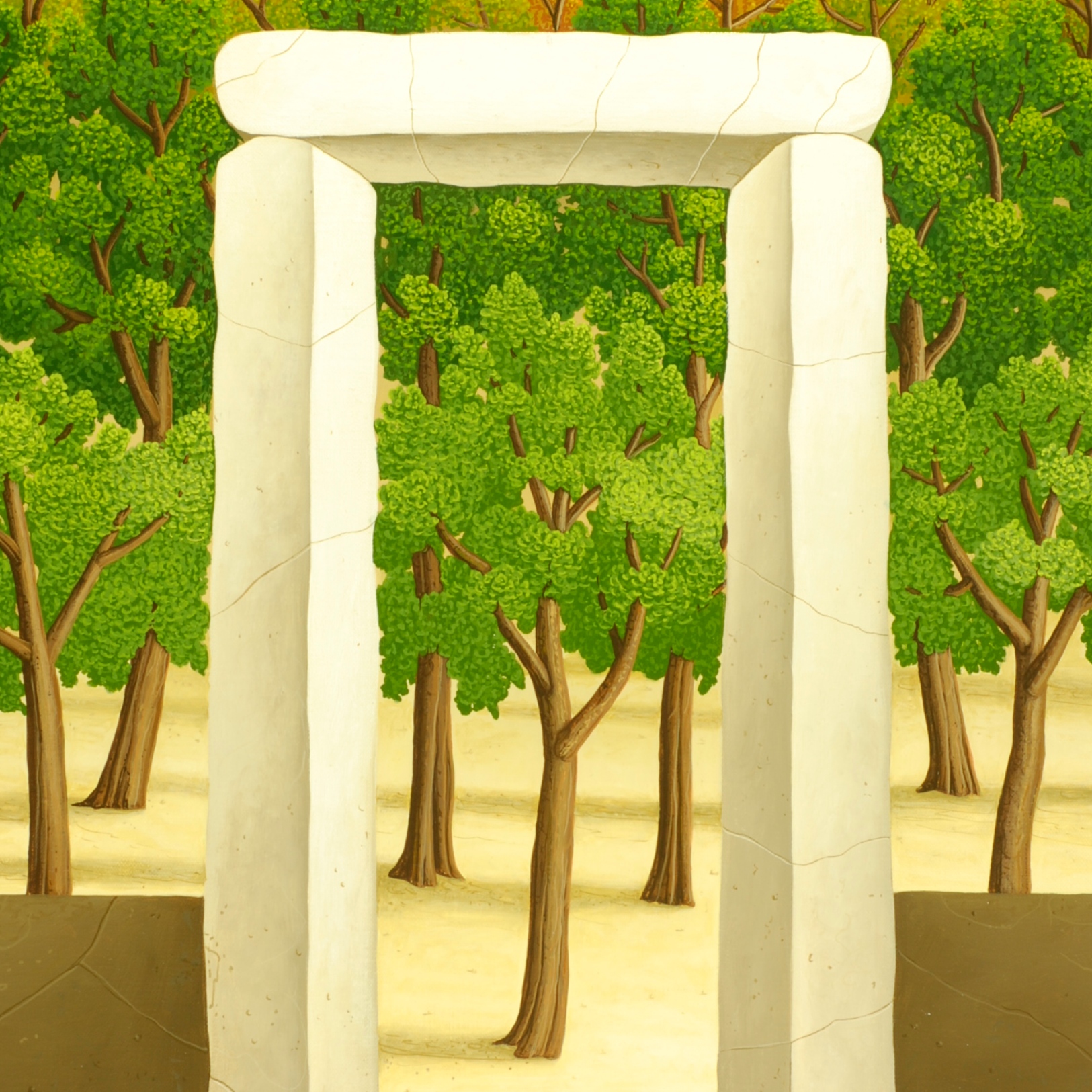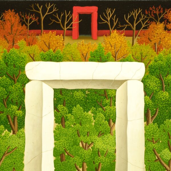 Die beiden Tore im Bild stehen für Leben und Tod. Die Bäume zwischen den Toren stehen für das vergängliche Leben. Der Blick durch das erste weisse Tor steht für den Eintritt ins Leben und die farbenfrohe Baumlandschaft lädt zum Verweilen ein. Im Hintergrund sieht man das rote und letzte Tor; und das Ende des Lebens kündigt sich durch die herbstlichen Bäume an. Hinter dem zweiten Tor ist es dunkel. Das Ölgemälde hat einen einzelgefertigten Modellrahmen und ist auf der Rückseite betitelt, datiert und signiert.